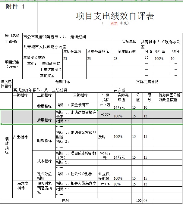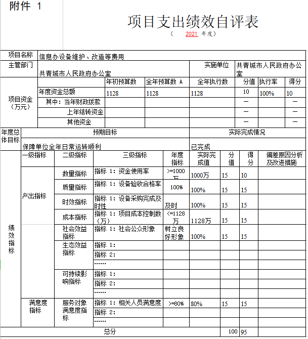 组织对“市委、市政府领导春节、八一走访慰问”、“一类-后勤服务工作经费”“信息办设备维护、改造等费用”等3个项目开展了部门评价,涉及一般公共预算支出1394万元,政府性基金预算支出0万元,国有资本预算支出0万元。从评价情况来看,本部门2021年度部门预算项目绩效自评为95分。