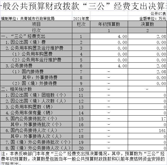 (二)公务接待费支出年初预算数为 4万元,决算数为2.08万元,完成预算的52 %,决算数较2020年减少1.03万元,下降33.12 %,主要原因是严格控制公务接待。决算数较年初预算数减少的主要原因是:严格控制公务接待。全年国内公务接待17批,累计接待 161人次,其中外事接待 0批,累计接待0人次,主要为:未发生此类事项。