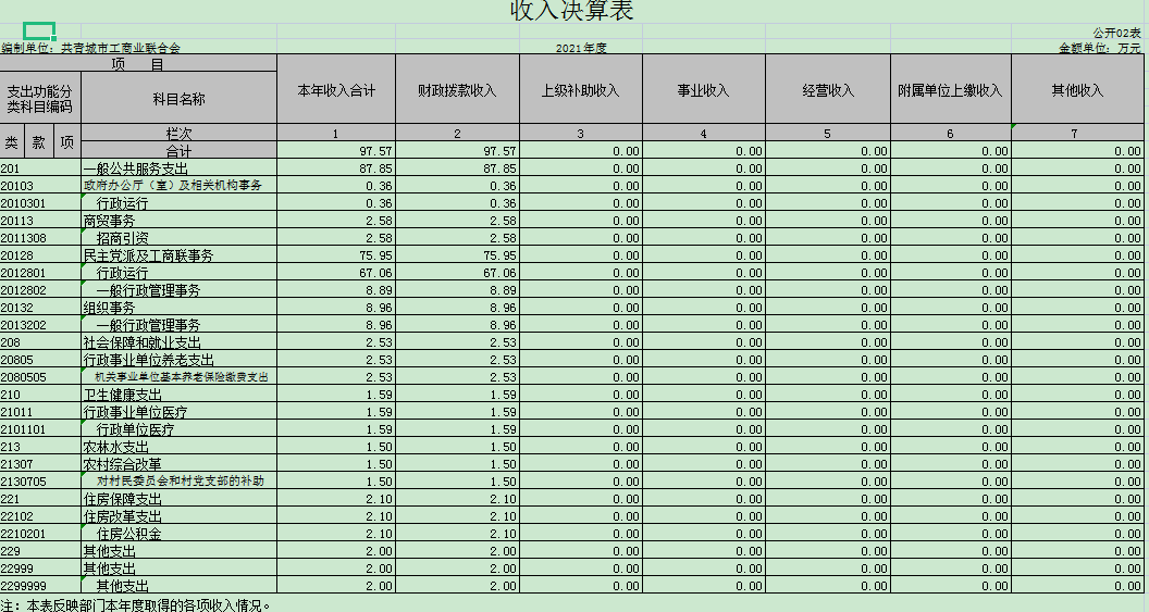 本部门2021年度收入总计 97.57万元,其中年初结转和结余 0万元,较2020年增加 23.11万元,增长 31.04 %;本年收入合计 97.57万元,较2020年增加23.11万元,增长 31.04 %,主要原因是:人员增加造成年初预算增加。