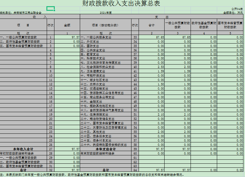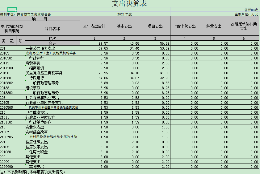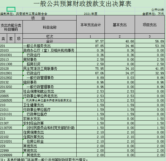 2021年共青城市工商业联合会预算总支出65.44万元。其中:基本支出33.44万元;项目支出32万元。2021年本部门实际完成预算97.57万元。其中:基本支出40.68万元;项目支出56.89万元。