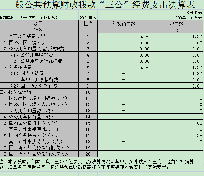 本部门2021年度一般公共预算财政拨款“三公”经费支出年初预算数为 5万元,决算数为 4.87万元,完成预算的 97.4 %,决算数较2020年增加4.38万元,增长993.88 %,其中: