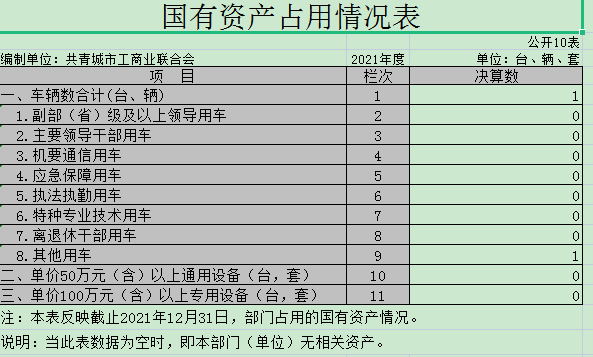 截至2021年12月31日,本部门(单位)国有资产占用情况见公开10表《国有资产占用情况表》。其中车辆中的其他用车主要是部门办公,但公车被市政府收回,资产尚未转移。