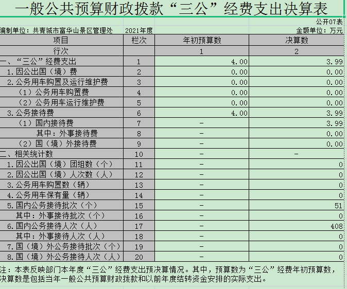 (二)公务接待费支出年初预算数为 4万元,决算数为3.99万元,完成预算的99.75 %,决算数较2020年减少 1万元,下降 20.04 %,主要原因是节约支出。决算数较年初预算数减少的主要原因是:节约了公务接待支出。全年国内公务接待 51批,累计接待 408人次,其中外事接待 0批,累计接待 0人次,主要为:节约了公务接待支出。