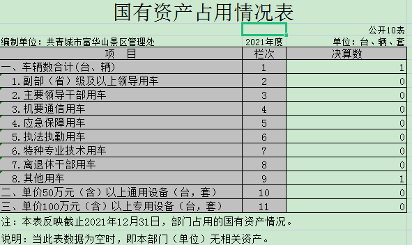 截至2021年12月31日,本部门(单位)国有资产占用情况见公开10表《国有资产占用情况表》。其中车辆中的其他用车主要是部门办公,但公车被市政府收回,资产尚未转移。。
