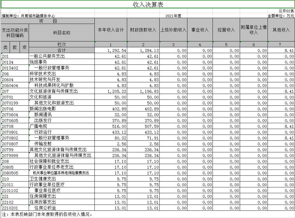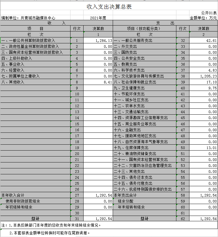 本部门2021年度收入总计1292.54万元,其中年初结转和结余 0万元,较2020年增加341.51万元,增长26.42%;本年收入合计1292.54万元,较2020年增加434.93万元,增长33.65%,主要原因是:新增人员费用及媒体宣传推广费用。