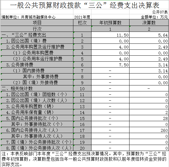 一、“三公”经费:反映财政拨款安排的因公出国(境)费、公务用车购置及运行费和公务接待费。其中,因公出国(境)费反映单位公务出国(境)的国际旅费、国外城市间交通费、住宿费、伙食费、培训费、公杂费等支出;公务用车购置及运行费反映单位公务用车车辆购置支出(含车辆购置税)及租用费、燃料费、维修费、过路过桥费、保险费、安全奖励费用等支出;公务接待费反映单位按规定开支的各类公务接待(含外宾接待)支出。