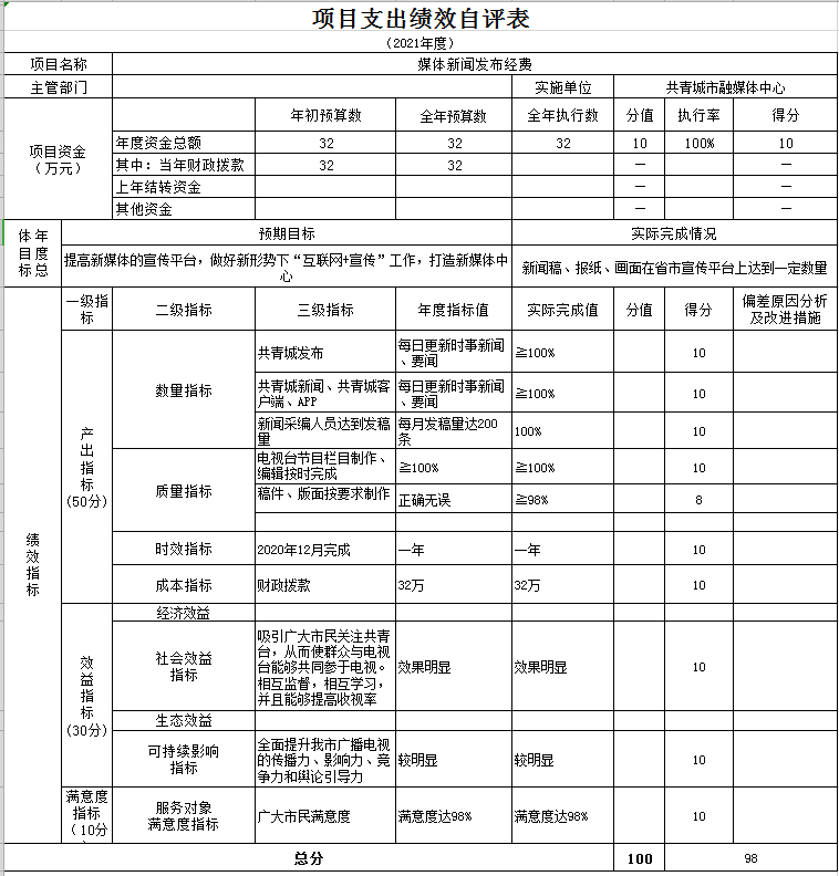 将2021年度融媒体中心绩效自评总报告进行公开如下:
