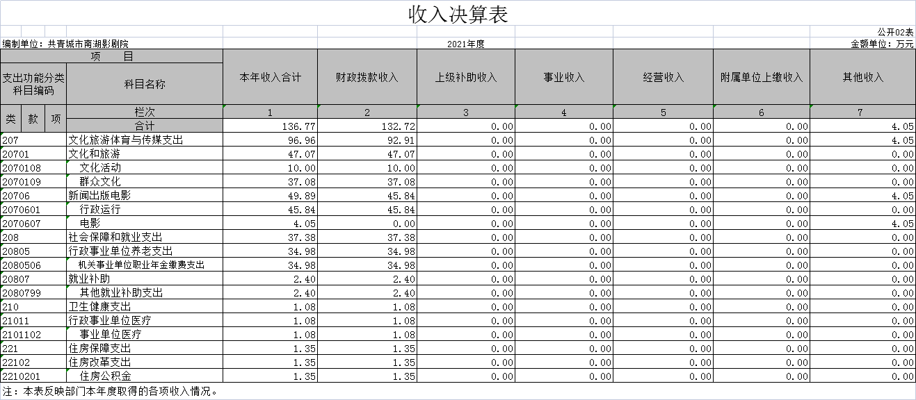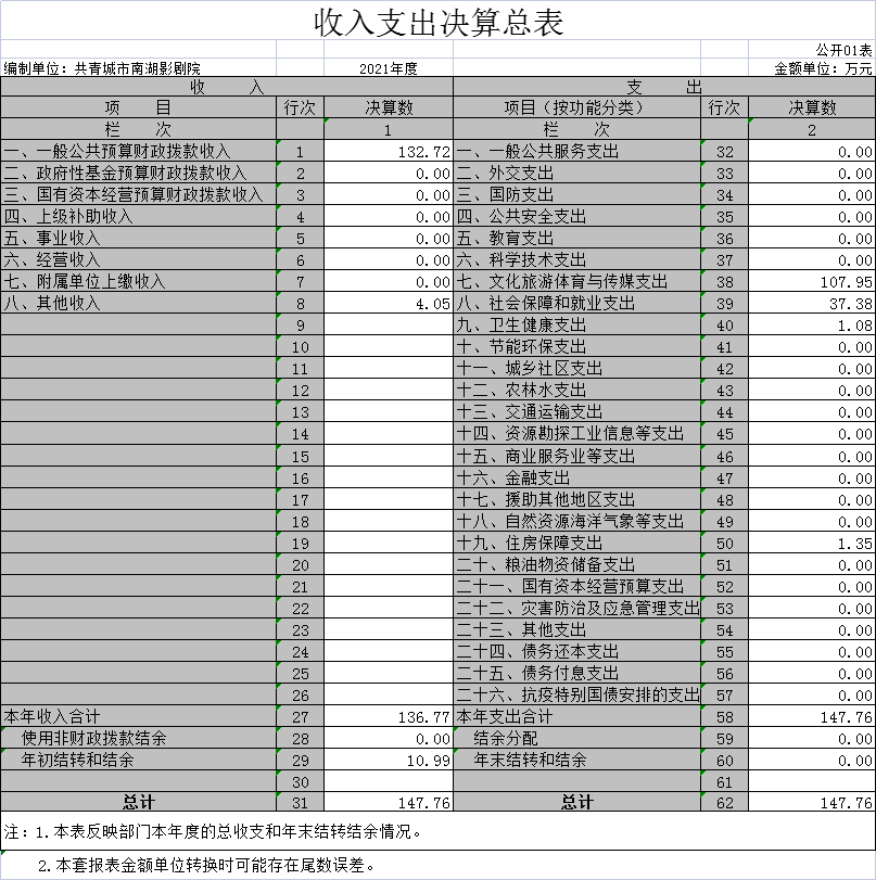 本部门2021年度收入总计147.76万元,其中年初结转和结余10.99万元,较2020年增加5.63万元,增长105%;本年收入合计136.77万元,较2020年减少133.5万元,下降49.39%,主要原因是:南湖影剧院单位合并入共青城市职工服务中心。