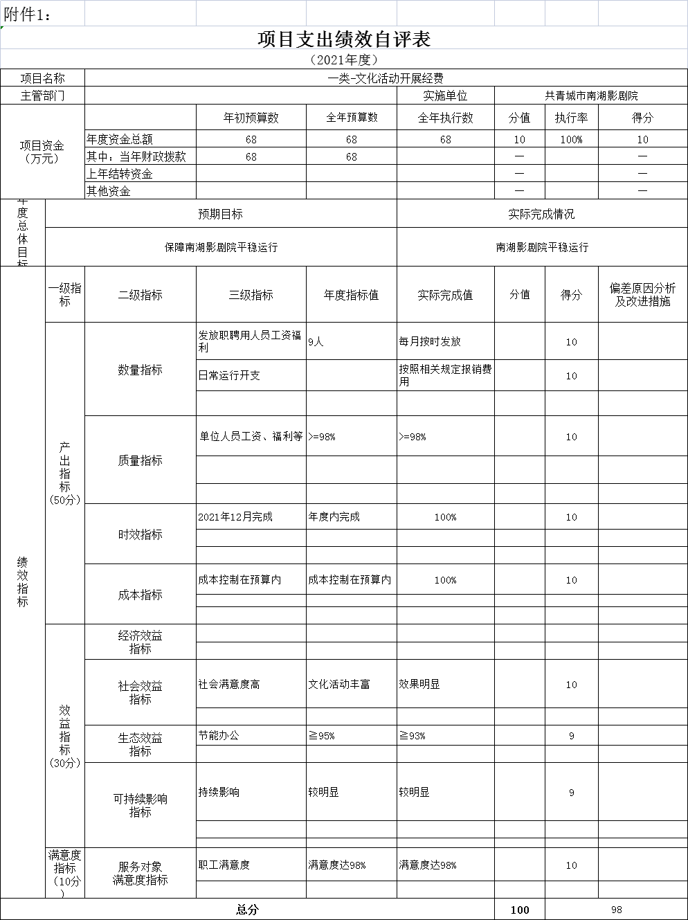 2021年,我单位积极履职,强化管理,较好地完成了年度工作目标。通过加强预算收支管理,不断建立健全内部管理制度,梳理内部管理流程,根据项目支出绩效评价指标体系,我单位2021年度保障运行工作经费项目支出68万元,评价得分为98分(详见附件1《项目支出绩效自评表》)。