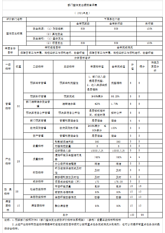 根据预算绩效管理要求,我部门组织对纳入2021年度部门预算范围的二级项目5个全面开展绩效自评,共涉及资金509万元,占项目支出总额的100 %。