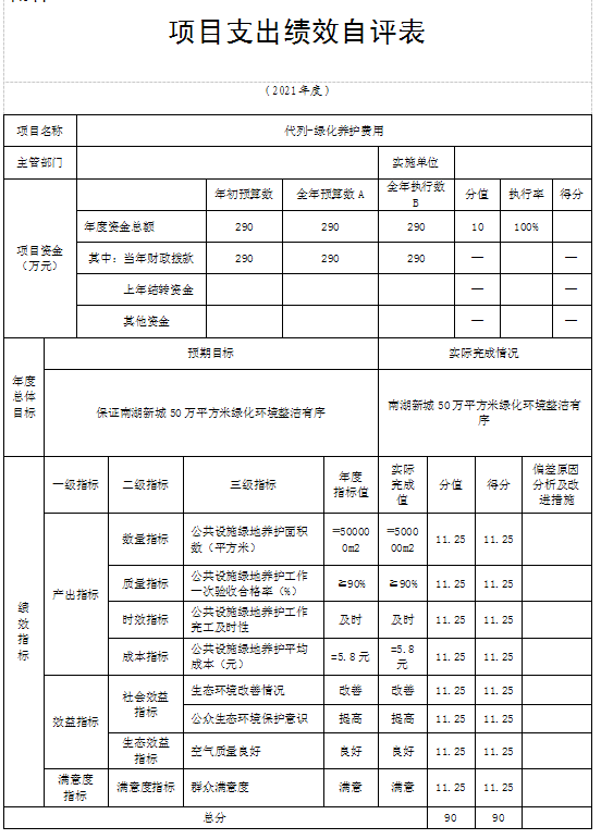项目绩效目标完成情况:本部门绩效目标设置合理。通过年初绩效目标的设置,一是保证机关正常运行,确保本年度实际支出公用经费总额不高于预算安排的公用经费总额;二是有效保障南湖新城卫生保洁工作正常开展,南湖新城2021年度道路环境卫生整洁优良,绿化面积扩大,市容环境得到极大提升;三是稳步推进2021年高校迎新工作,迎新学生覆盖率得到有效提高。