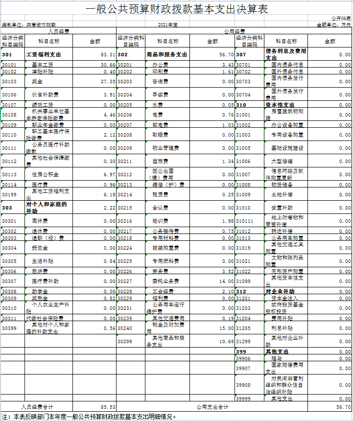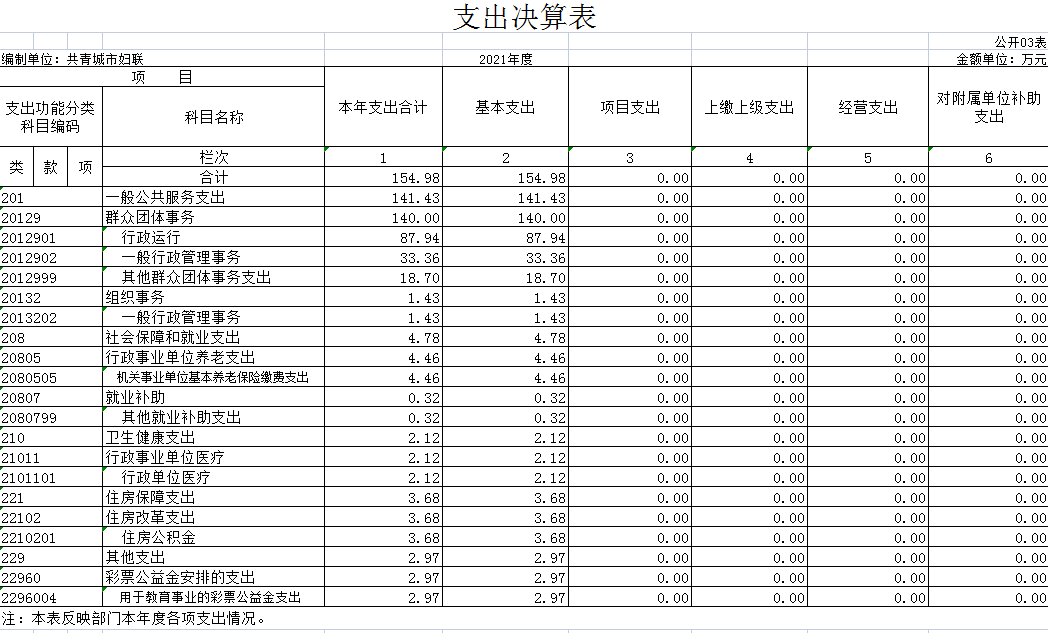 本部门2021年度支出总计154.98万元,其中本年支出合计154.98万元,较2020年减少54.69万元,下降26.08%,主要原因是:上年末结转结余减少;年末结转和结余0万元,较2020年减少43.71万元,下降100%,主要原因是:2021年无江西省财政厅省级专项彩票公益金资助妇联系统儿童活动中心项目资金结转结余。