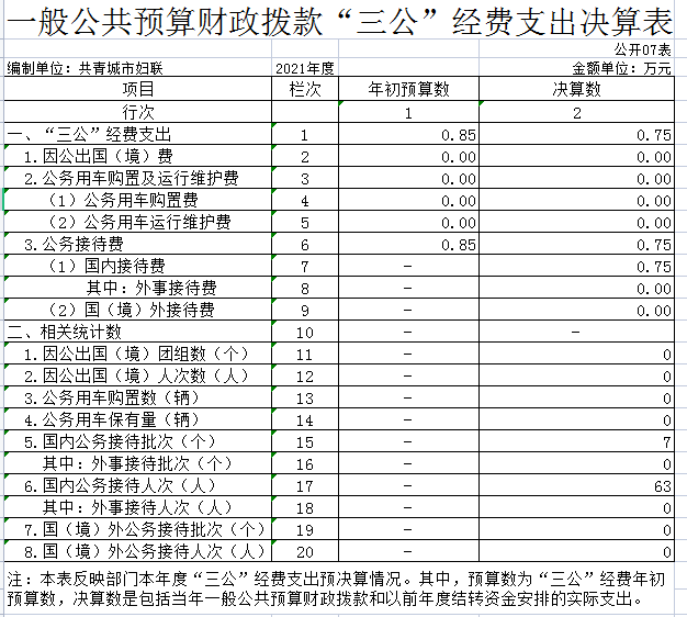 1、“三公”经费支出:指用一般公共预算财政拨款安排的因公出国(境)费、公务用车购置及运行维护费和公务接待费。其中,因公出国(境)费反映单位公务出国(境)的国际旅费、国外城市间交通费、住宿费、伙食费、培训费、公杂费等支出;公务用车购置及运行维护费反映单位公务用车车辆购置支出(含车辆购置税、牌照费),按规定保留的公务用车燃料费、维修费、过桥过路费、保险费、安全奖励费用等支出;公务接待费反映单位按规定开支的各类公务接待(含外宾接待)支出。