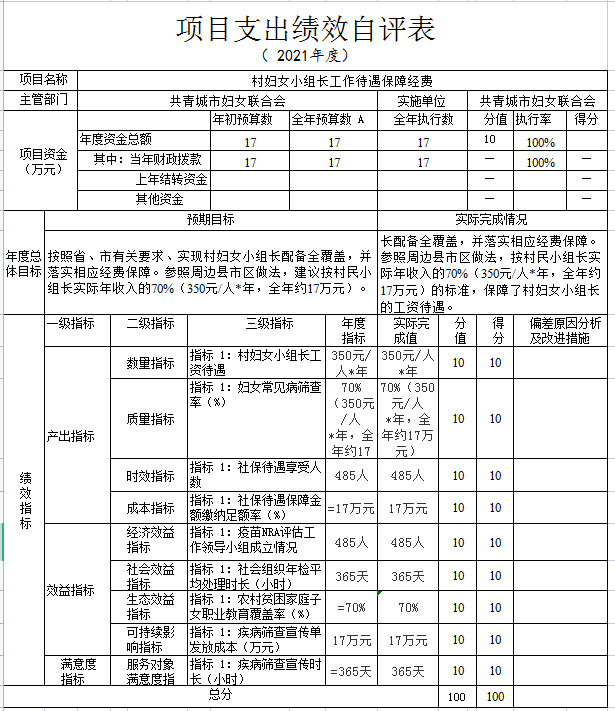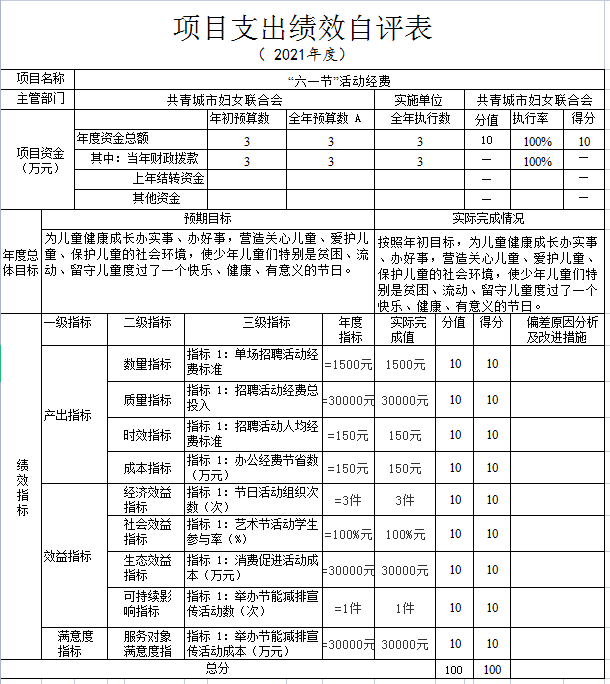 我部门今年在部门决算中反映“一类-人均两元工作经费”、“三八节活动经费”、“六一节活动经费”、“儿童活动中心活动经费”、“村妇女小组长工作待遇保障经费”绩效自评结果。项目绩效自评总体综述:根据年初设定的绩效目标,项目绩效自评得分为100分。项目全年预算数为58万元,执行数为58万元,完成预算的100%。项目绩效目标完成情况:2021年按照年初目标,及时推进工作,5个绩效项目均取得圆满成功,具体如下:一是精心组织线下轮训,提升妇联执委“硬核”实力。在各乡(镇、街道)开展基层妇联组织暨村妇女小组长轮训班,共6场参训人数400余人;开展“永远跟党走”女性读书月活动,参与女性达600余人,进一步武装头脑、指导推动工作。二是用好用活数字阵地,引导妇女云端学知学技。在妇联微信公众号平台制作《她学习》专栏,当好“传声筒”,播好政策音。今年累计发布技术学习92期。三是选树宣传先进典型,激励妇女干事创业。全年推选出全省巾帼文明岗1个、全省抗疫最美家庭1户、全省书香家庭1户、九江市第十二届巾帼文明岗3个、巾帼建功标兵3名、九江市三八红旗手和红旗集体各1名、九江市最美家庭3户。开展“三八”表彰活动,表彰三八红旗手30名、三八红旗集体5个;开展“万户家庭低碳行 垃圾分类我先行”演出活动,表彰在全市范围内推选出的清洁家庭30户,最美庭院30户,最美执委17名,优秀村妇女小组长13名。通过选先进、树典型、展形象,激励广大女性奋发有为、踊跃争先。四是组织共青城市“赣鄱红色娘子军”宣讲团以“板凳课堂”“定制演出”等灵活形式进基层宣讲10场覆盖1000余人;五是特色活动有活力。打造“绘本漂流”活动品牌,送亲子绘本阅读服务进村(社区)8场;六是为民办事暖民心。通过“大走访”“大调研”,梳理出25条活动清单,对照清单开展了城乡女性“法律明白人”培养工程巡回讲座4场;开展女性健康讲座3场,筛查农村两癌免费769例;开展“红雨伞”等关爱未成年人活动10场;对我市30户困难家庭发放“关爱新生命-儿童营养改善”公益项目资助的第一批免费婴幼儿奶粉。