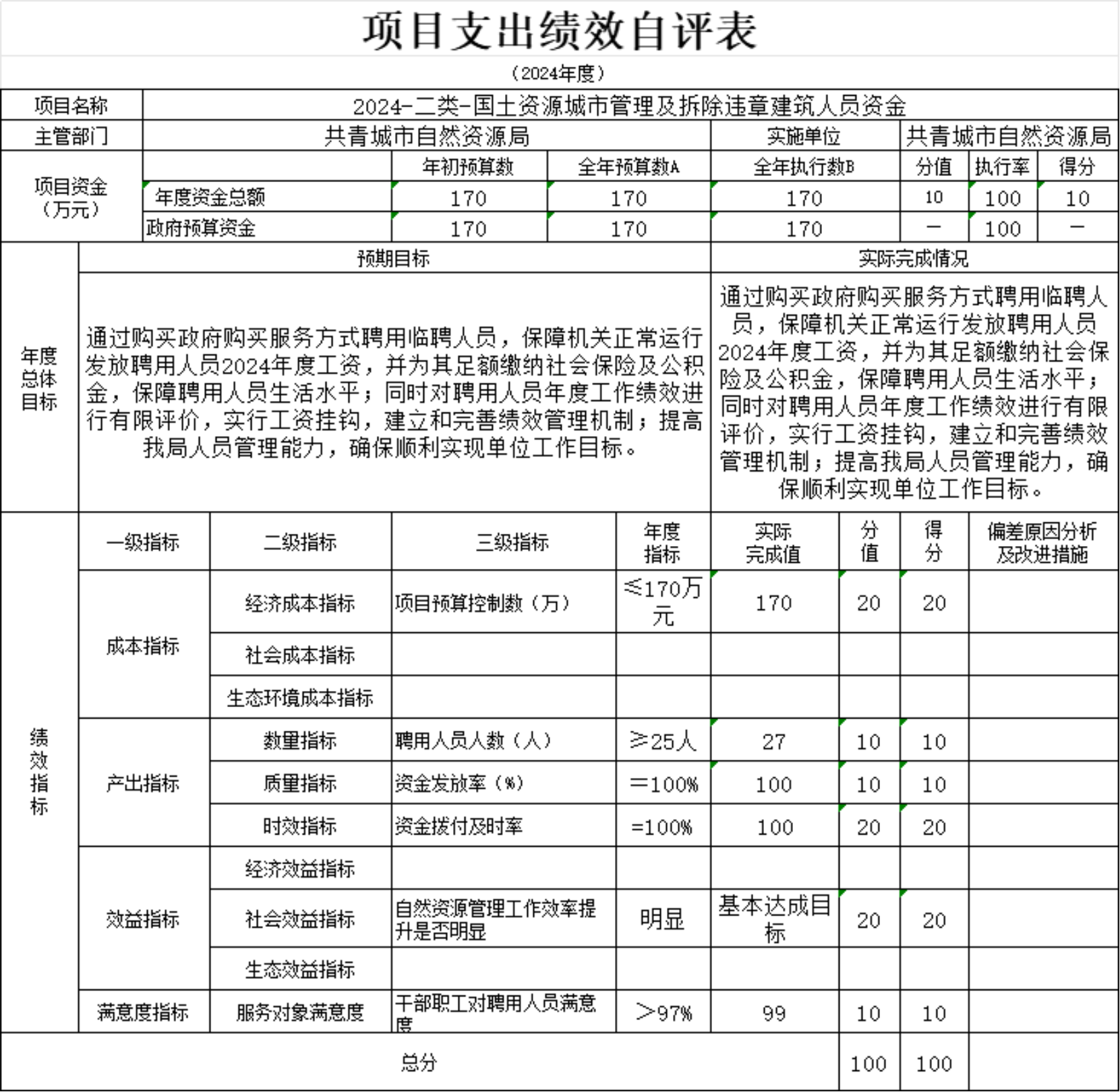 存在的问题:国土资源城市管理及拆除违章建筑人员资金170万元无法保障聘用人员全年的工资福利等开支,2024年度聘用人员工资福利等开支约240万元,日常运行经费弥补了70万元的资金缺口。