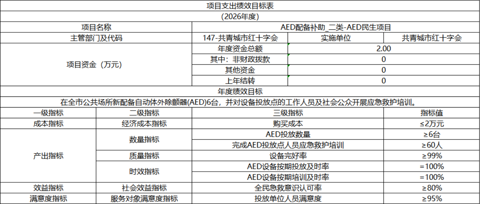7)绩效目标和指标:经济成本指标:购买成本≤2万元;数量指标:AED投放数量≥6台、完成AED投放点人员应急救护培训≥60人;质量指标:设备完好率≥99%;时效指标:AED设备按期投放及时率=100%、AED设备按期培训及时率=100%;社会效益指标:全民急救意识认可率≥80%;服务对象满意度指标投放单位人员满意度≥95%。