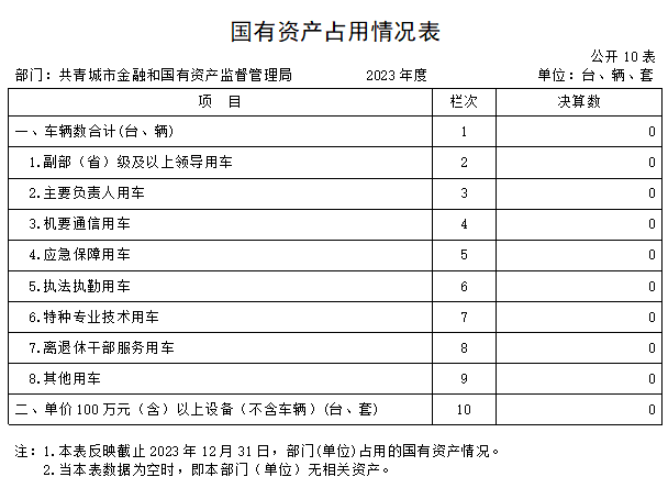 截止2023年12月31日,本部门共有车辆0辆(台),其中:副部(省)级及以上领导用车0辆、主要负责人用车0辆、机要通信用车0辆、应急保障用车0辆、执法执勤用车0辆、特种专业技术用车0辆、离退休干部服务用车0辆、其他用车0辆。本部门单价100万元(含)以上设备(不含车辆)0台(套)。