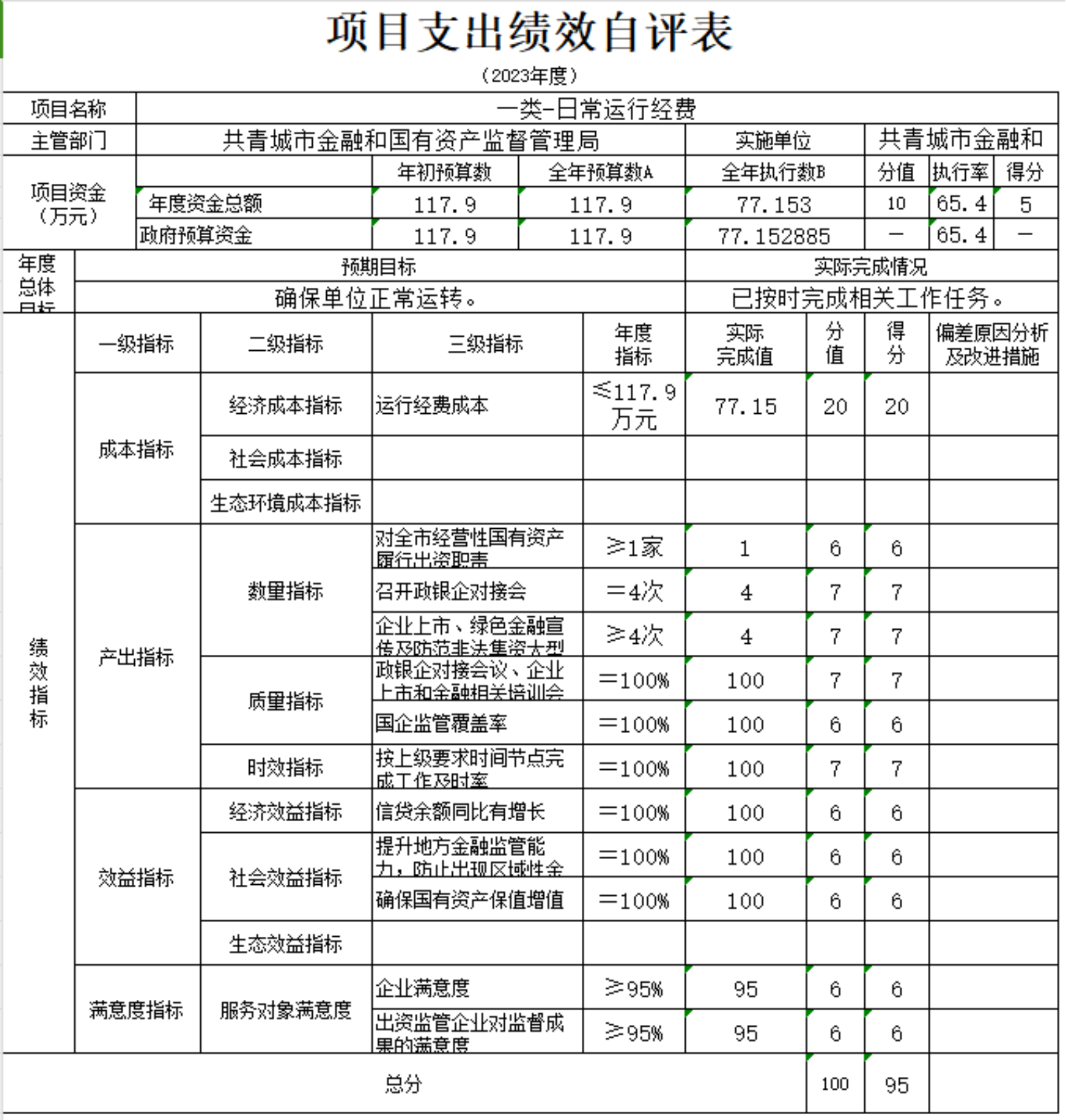 共青城市金融和国有资产监督管理局(本级)“日常运转经费项目支出绩效自评表”如下: