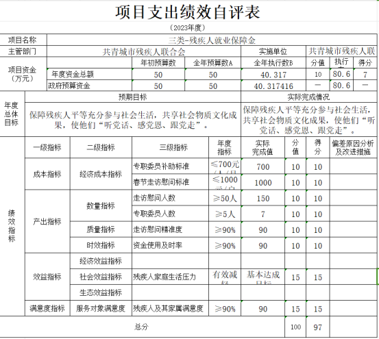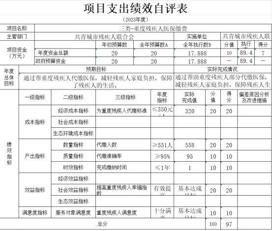 共青城市残疾人联合会(本级)“重度残疾人医保缴费和残疾人就业保障金项目支出绩效自评表”如下: