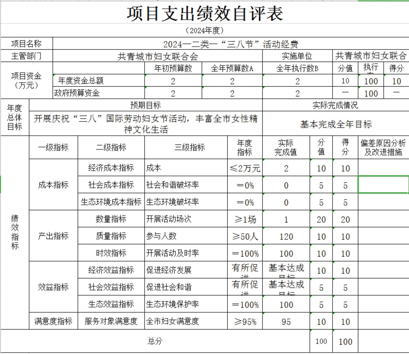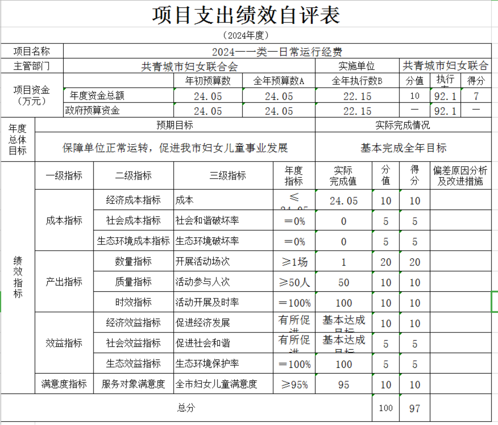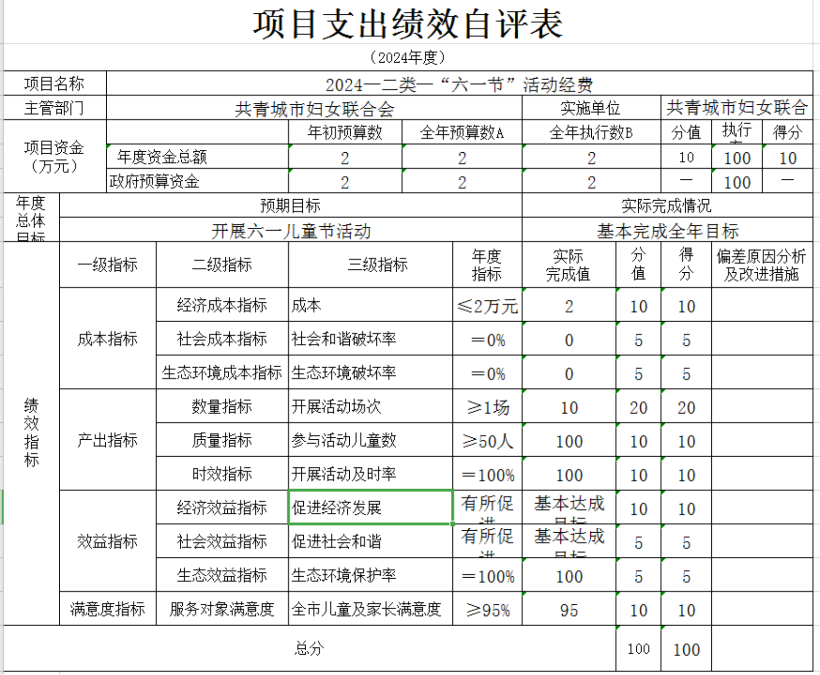 共青城市妇女联合会(本级)“一类-日常运行经费 ”“六一节经费”、“三八节经费”、“儿童活动中心经费”、“ 三类-村妇女小组长工资待遇 ” 等项目支出绩效自评结果如下: