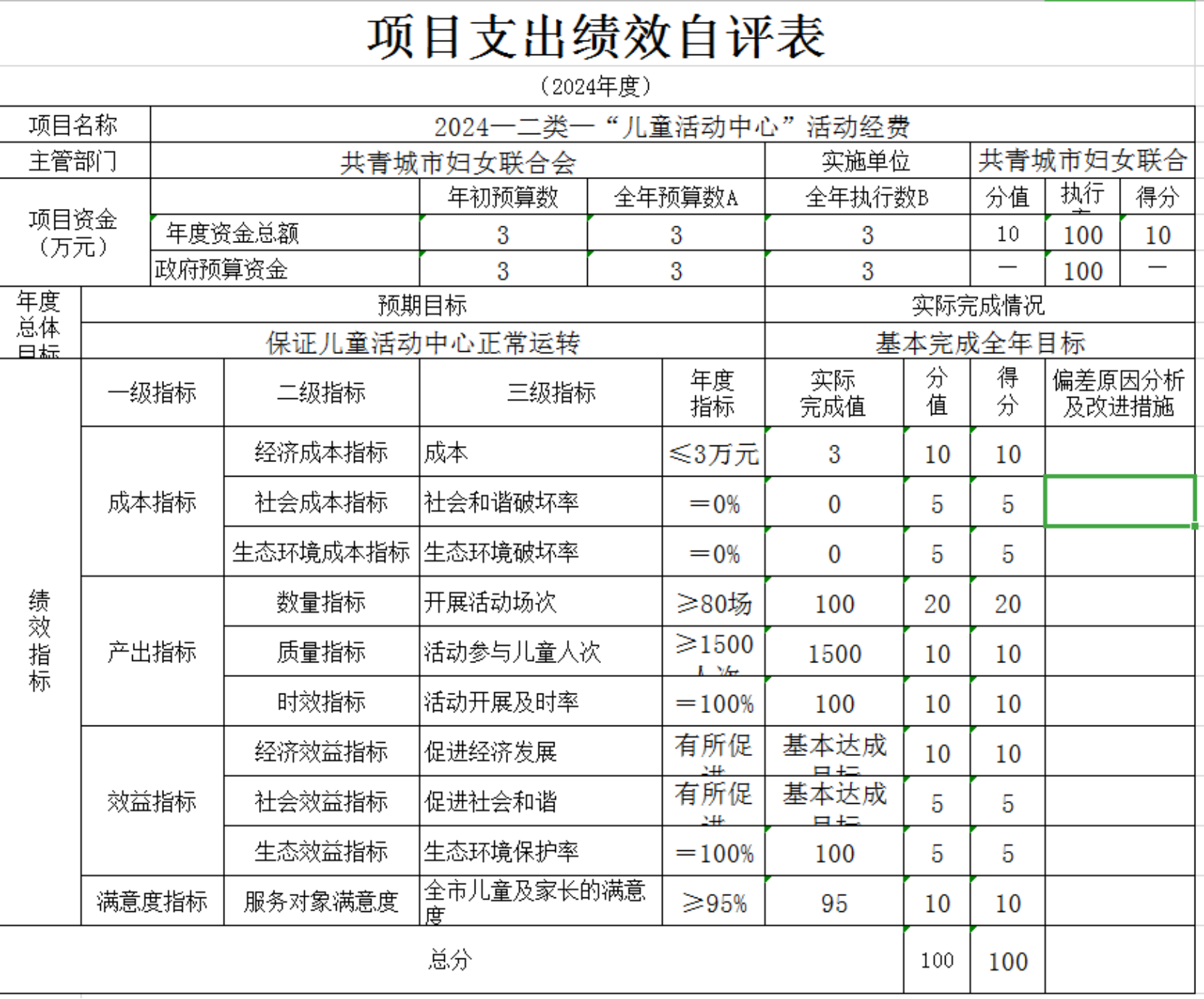 我单位成立了 2024年度项目支出部门绩效评价工作小组。工作小组认真核查相关资料,逐项严格评分并完成绩效评价报告,评价结果力求客观、 公正、全面地反映 2024年度“儿童活动中心”活动经费实施的实际绩效。