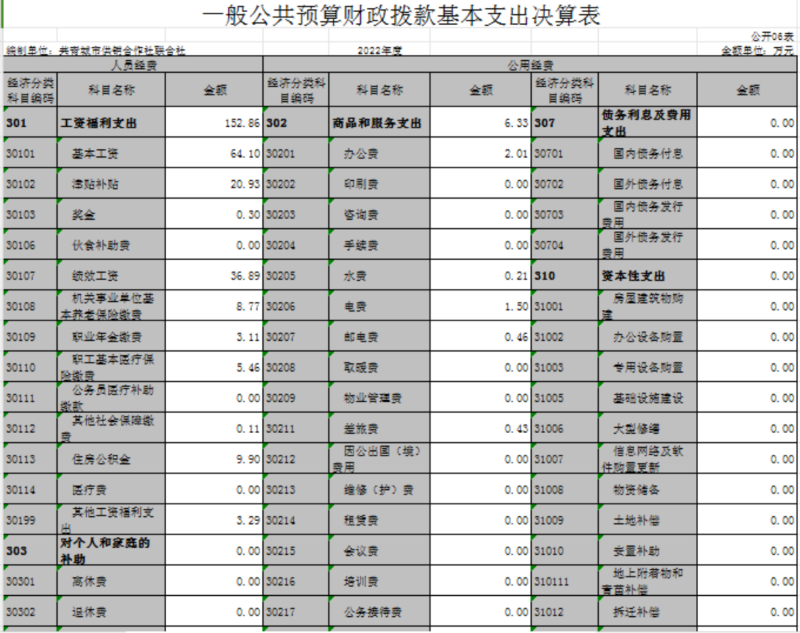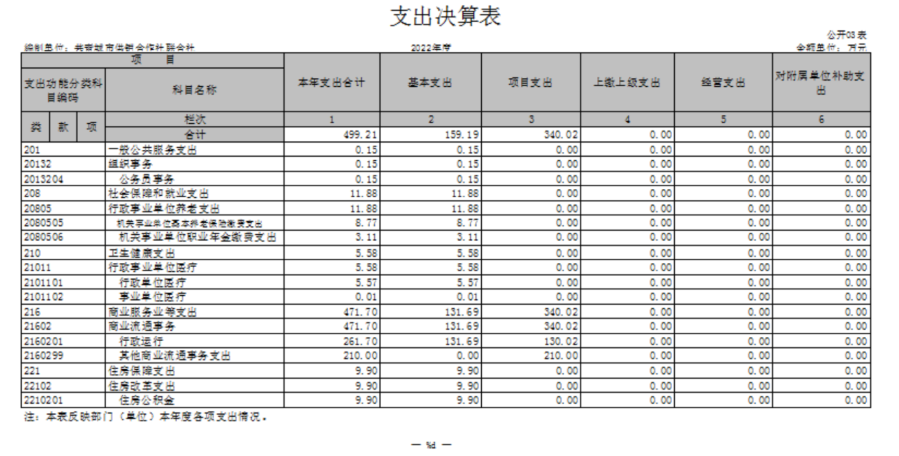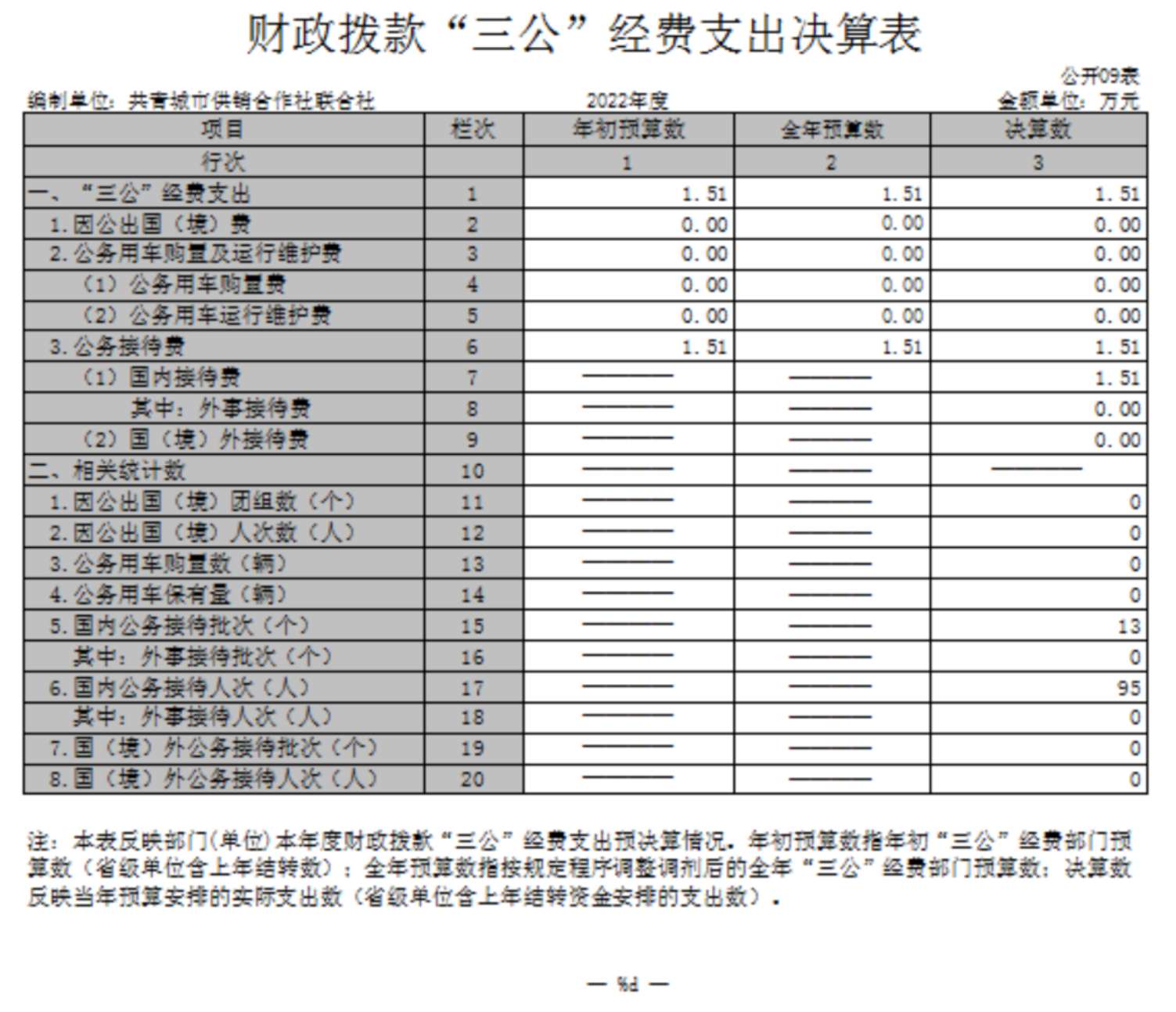 (二)公务接待费支出全年预算数为2.06万元,决算数为1.51万元,完成全年预算的73.3%,决算数较2021年减少1.98万元,下降56.73%,主要原因是:公务接待业务减少。决算数较全年预算数减少的主要原因是:公务接待业务减少。全年国内公务接待13批,累计接待95人次,其中外事接待0批,累计接待0人次,主要为:考察供销社工作。