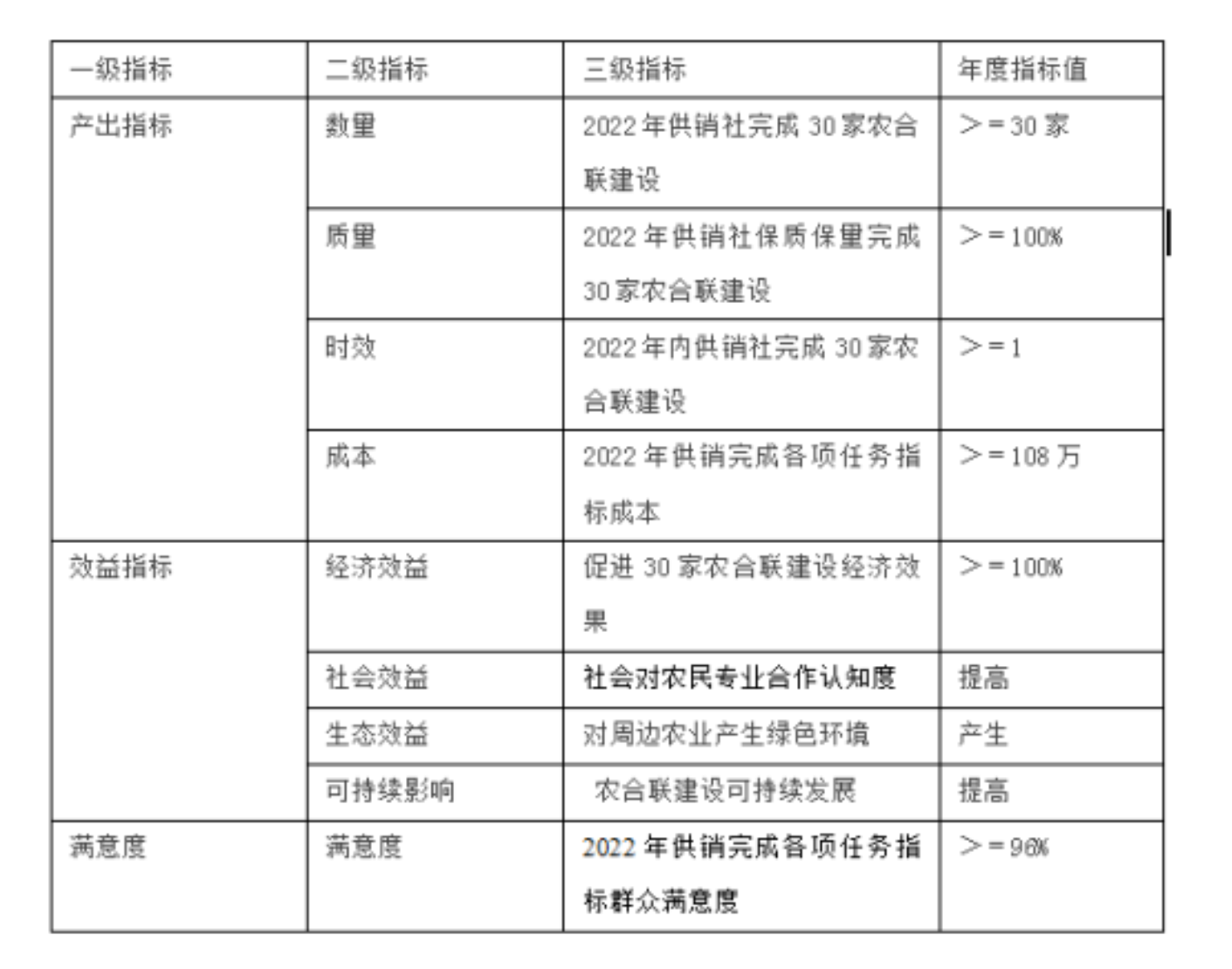 总体绩效目标是2022年供销社完成30家农合联建设,保质保量。