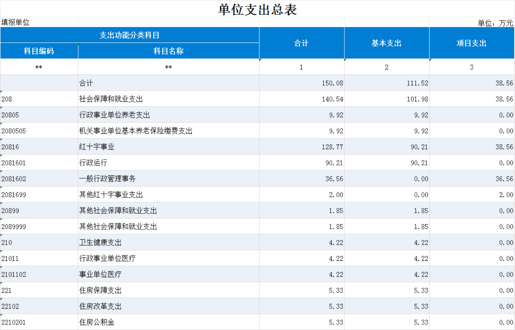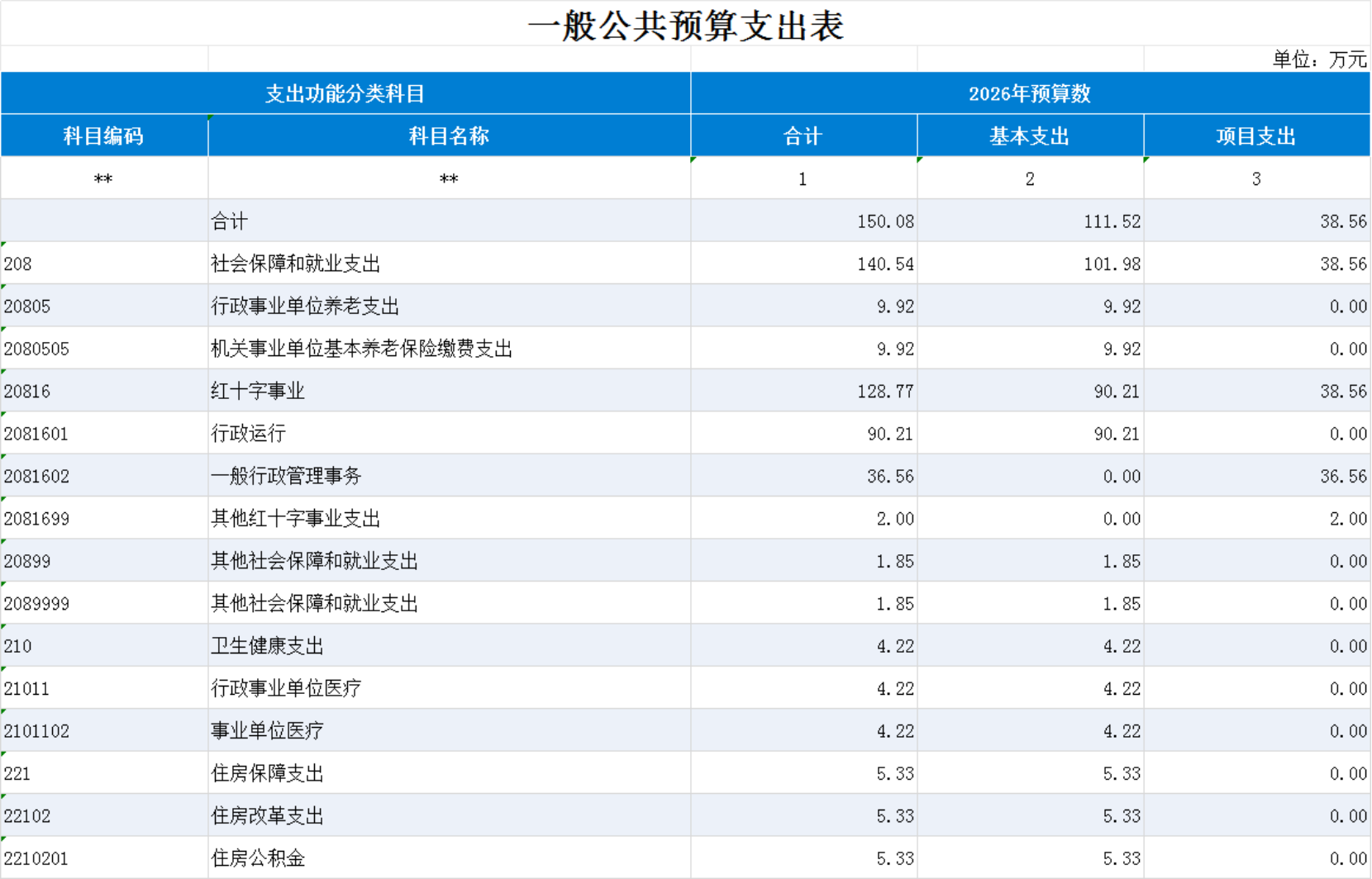 2026年共青城市红十字会财政拨款支出预算150.08万元,占支出预算总额的100%,较上年预算安排增加55.11万元,增加的原因是26年新增2名在职人员。具体支出情况是:按支出功能科目划分: 一般公共服务支出0万元,占财政拨款支出的0%;教育支出0万元,占财政拨款支出0%;社会保障和就业支出140.54万元,占财政拨款支出的93.64%;卫生健康支出4.22万元,占财政拨款支出的2.81%;住房保障支出5.32万元,占财政拨款支出的3.55%。