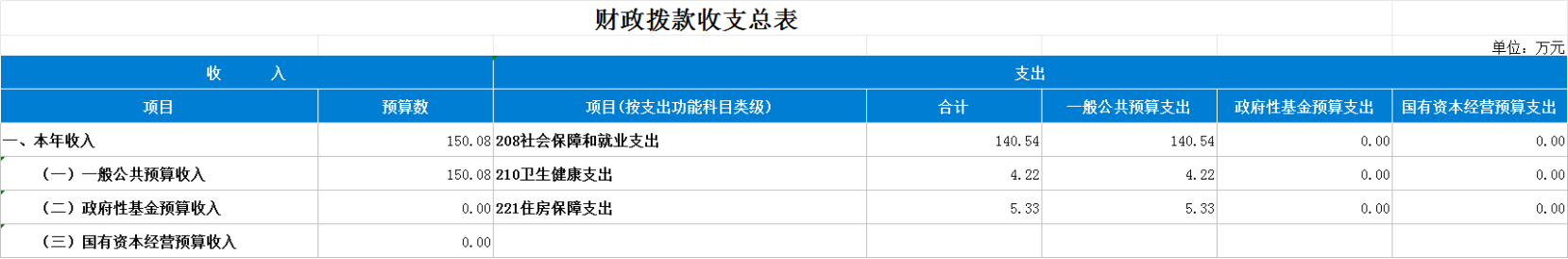 按支出功能科目划分:一般公共服务支出0万元,占支出预算总额的0%,较上年预算安排增加0万元;教育支出0万元,占支出预算总额的0%,较上年预算安排增加0万元;科学技术支出0万元,占支出预算总额的0%,较上年预算安排增加0万元;社会保障和就业支出140.54万元,占支出预算总额的93.64%,较上年预算安排增加51.57万元;卫生健康支出4.22万元,占支出预算总额的2.81%,较上年预算安排增加1.46万元;农林水支出0万元,占支出预算总额的0%,较上年预算安排增加0万元。住房保障支出5.32万元,占支出预算总额的3.55%,较上年预算安排增加2.08万元。