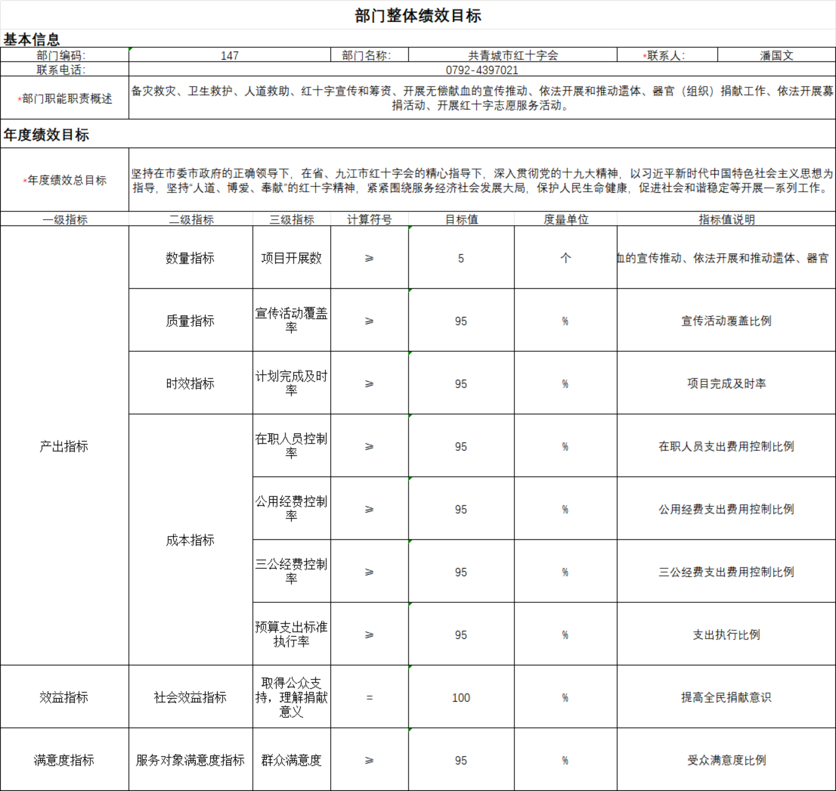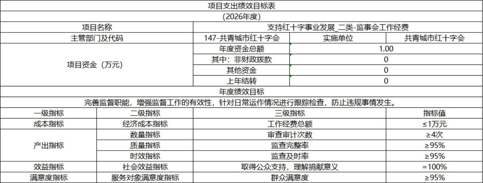 7)绩效目标和指标:经济成本指标:工作经费总额≤1万元;数量指标:审查审计次数≥4次;质量指标:监查完整率≥95%;时效指标:监查及时率≥95%;社会效益指标:取得公众支持,理解捐献意义=100%;服务对象满意度指标:群众满意度≥95%。