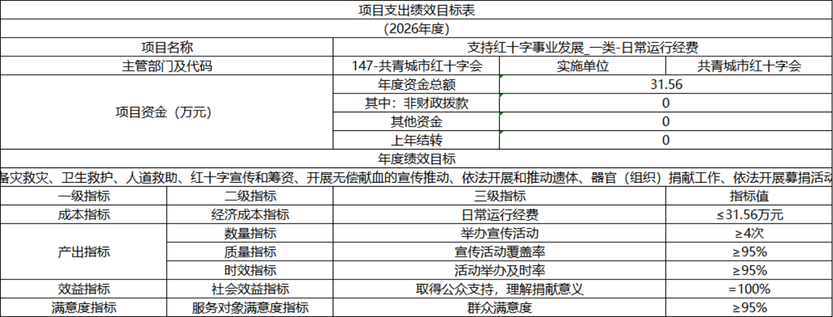 7)绩效目标和指标:经济成本指标:日常运行经费≤31.56万元;数量指标:举办宣传活动≥4次;质量指标:宣传活动覆盖率≥95%;时效指标:活动举办及时率≥95%;社会效益指标:取得公众支持,理解捐献意义=100%;服务对象满意度指标:群众满意度≥95%