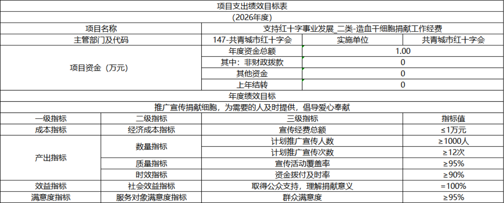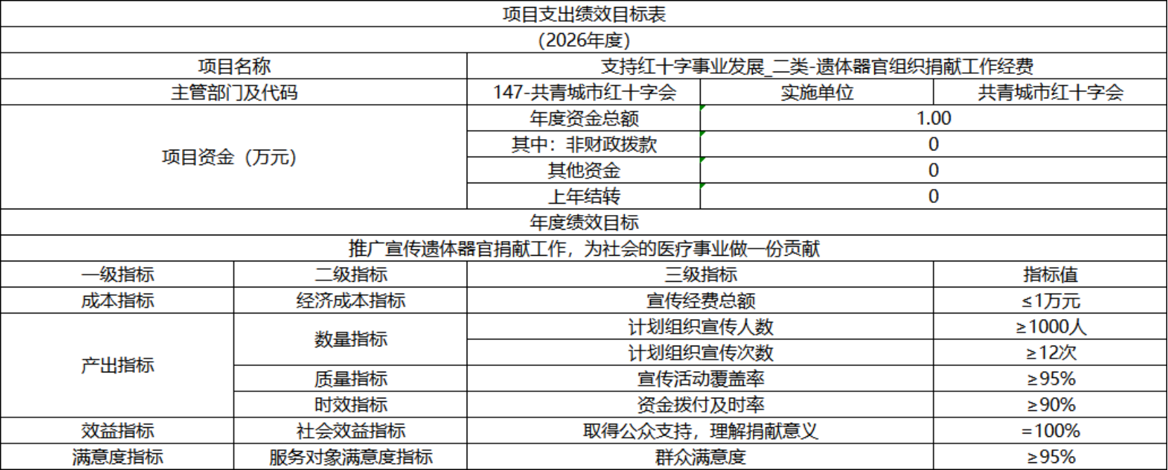 7)绩效目标和指标:经济成本指标:宣传经费总额≤1万元;数量指标:计划组织宣传人数≥1000人、计划组织宣传次数≥12次;质量指标:宣传活动覆盖率≥95%;时效指标:资金拨付及时率≥90%;社会效益指标:取得公众支持,理解捐献意义=100%;服务对象满意度指标:群众满意度≥95%。