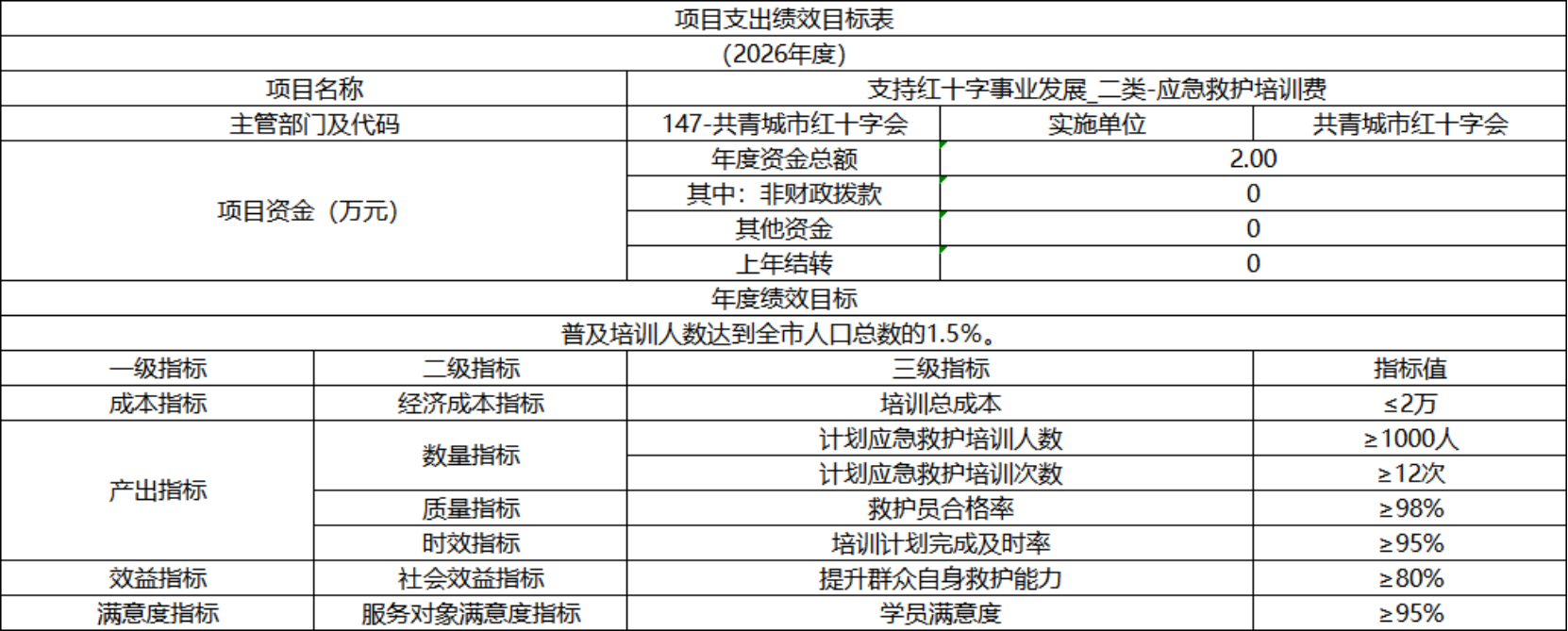 7)绩效目标和指标:经济成本指标:培训总成本≤2万;数量指标:计划应急救护培训人数≥1000人、计划应急救护培训次数≥12次;质量指标:救护员合格率≥98%;时效指标:培训计划完成及时率≥95%;社会效益指标:提升群众自身救护能力≥80%;服务对象满意度指标:学员满意度≥95%。