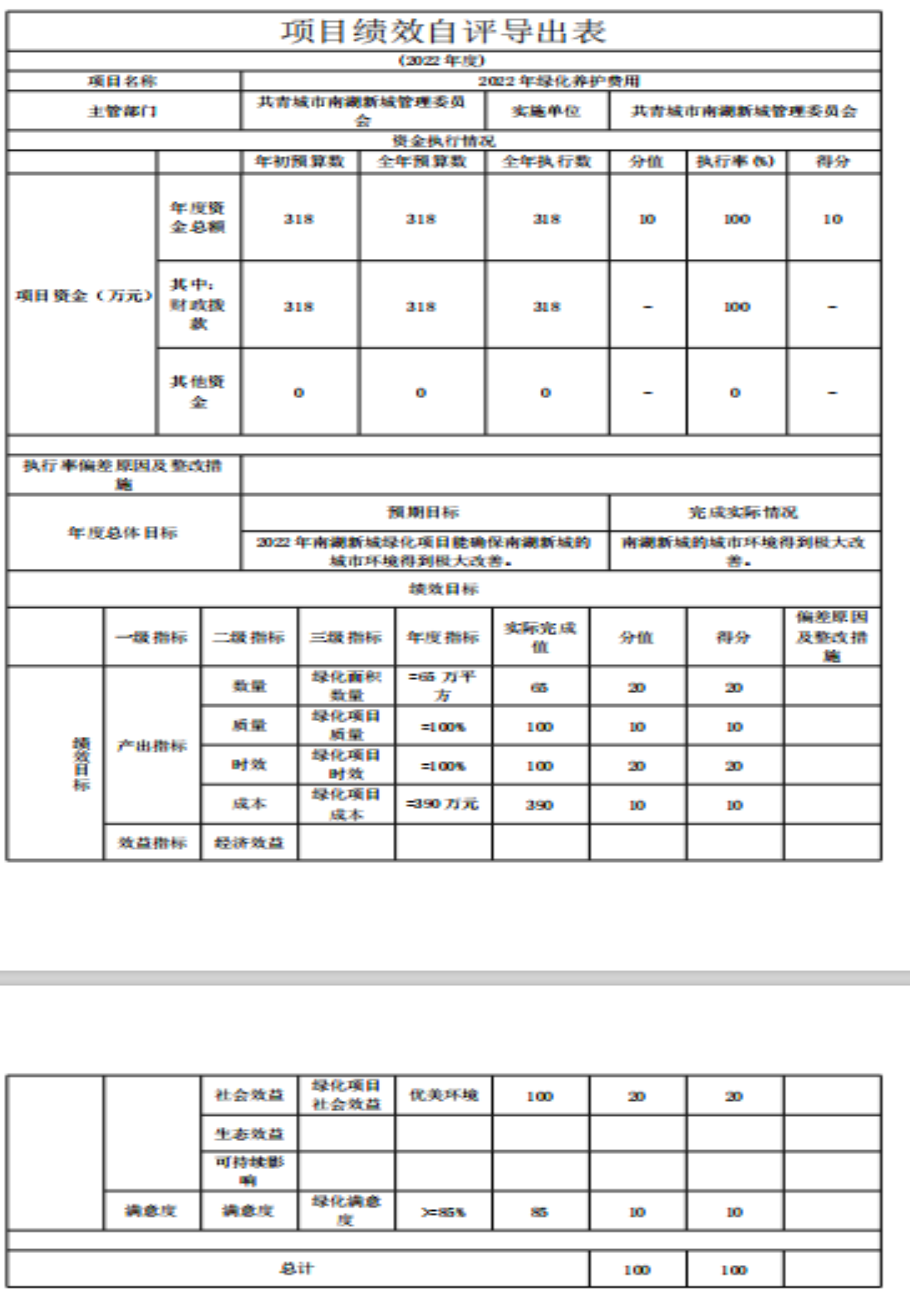 组织对“决战三城领导办公室工作经费”、“2022年绿化养护费”等3 个项目开展了部门评价,涉及一般公共预算支出380万元,政府性基金预算支出0 万元,国有资本预算支出0万元。从评价情况来看,本部门项目执行数与预算数偏离度小,有效保障了南湖新城一切工作顺利展开。