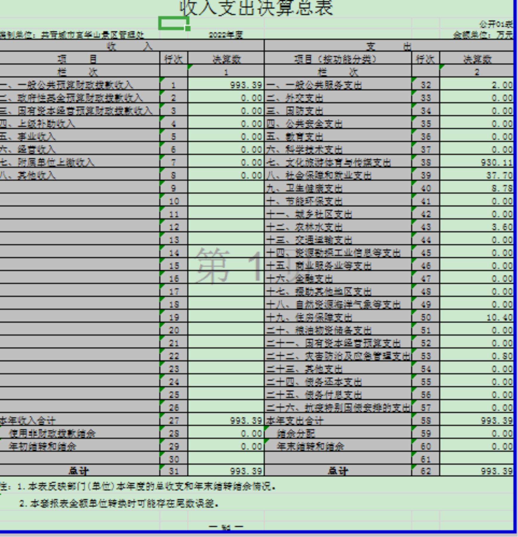 本部门2022年度支出总计 993.39 万元,其中本年支出合计 993.39 万元,较2021年减少 534.38 万元,下降 35 %,主要原因是:项目支出减少;年末结转和结余 0 万元,较2021年增加(减少) 0 万元,增长(下降) 0 %,主要原因是:年末无结余。
