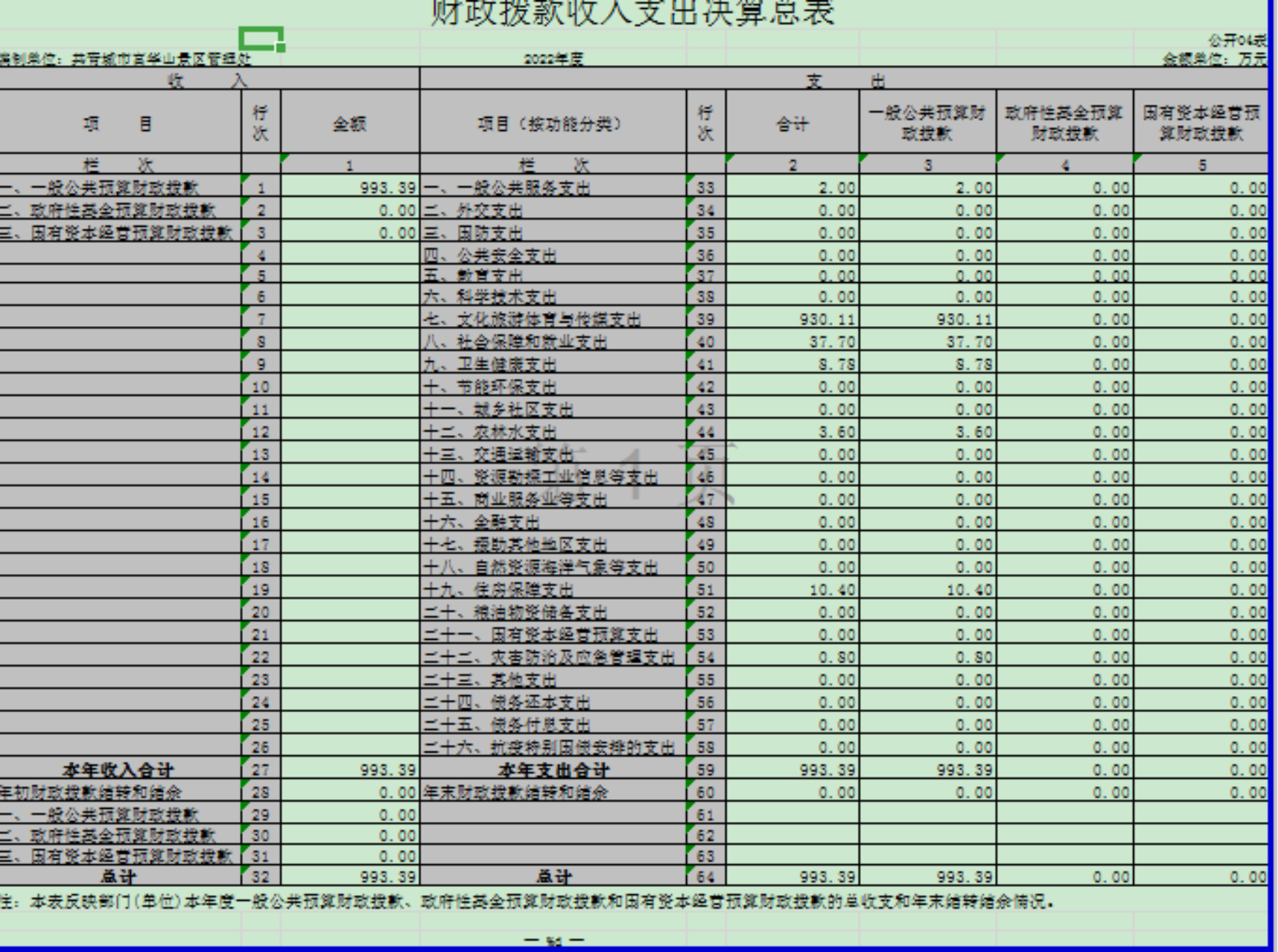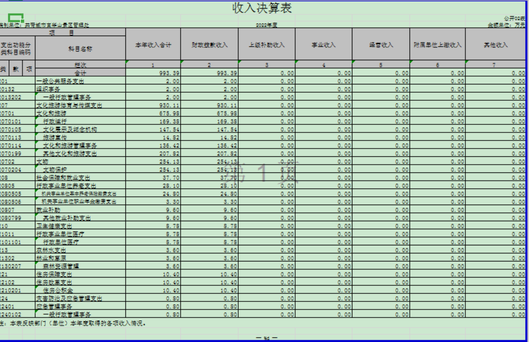 2022年完成预算收入总计为993.39万元。其中:一般公共预算收入为993.39万元,占收入总额的100%;国库集中支付结转(结余)0万元,占收入总额的0%。