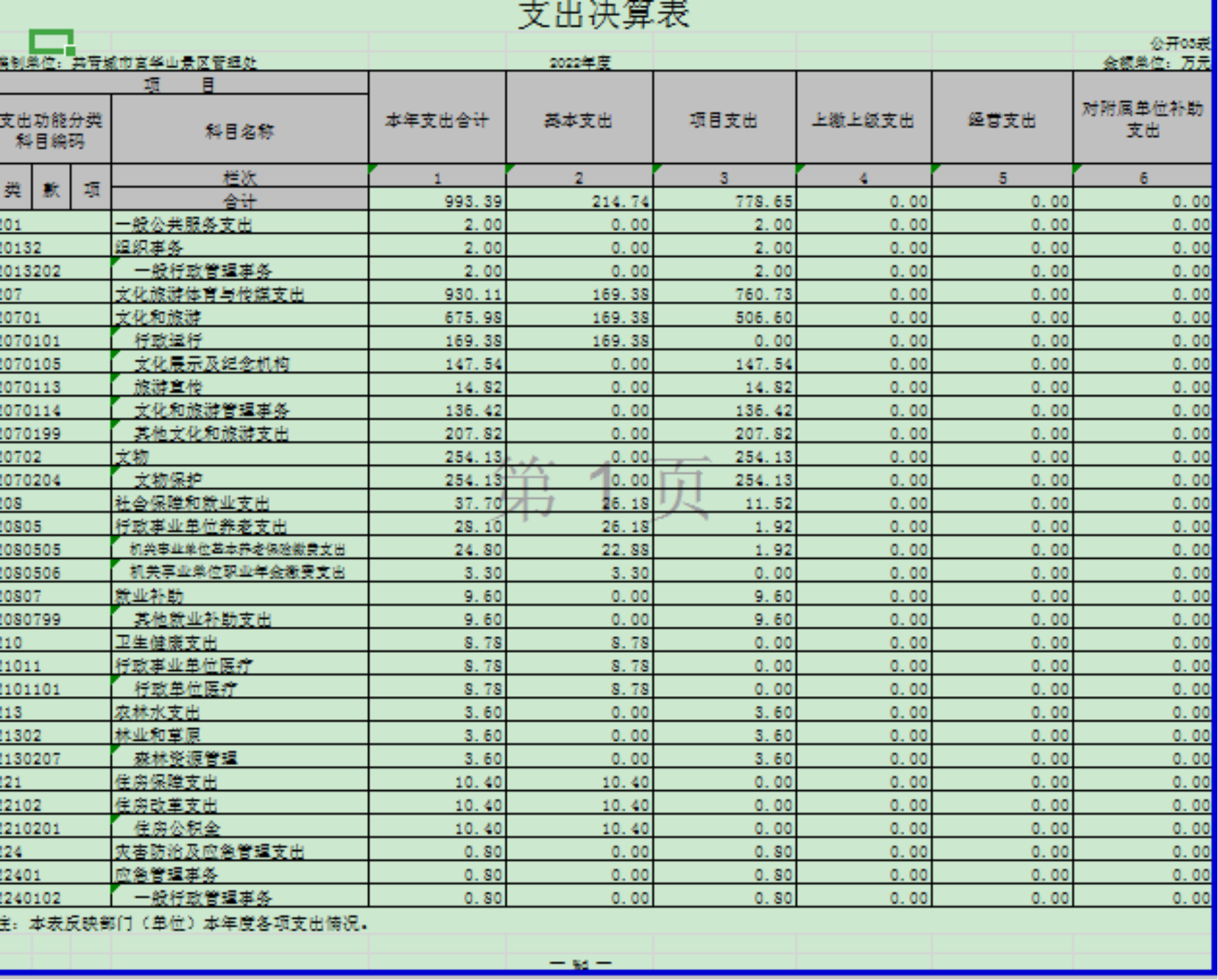 按支出功能科目划分:一般公共服务支出2万元;文化旅游体育与传媒支出930.11万元;社会保障和就业支出37.7万元;卫生健康支出8.78万元;农林水支出3.6万元;住房保障支出10.4万元;灾害防治及应急管理支出0.8万元。