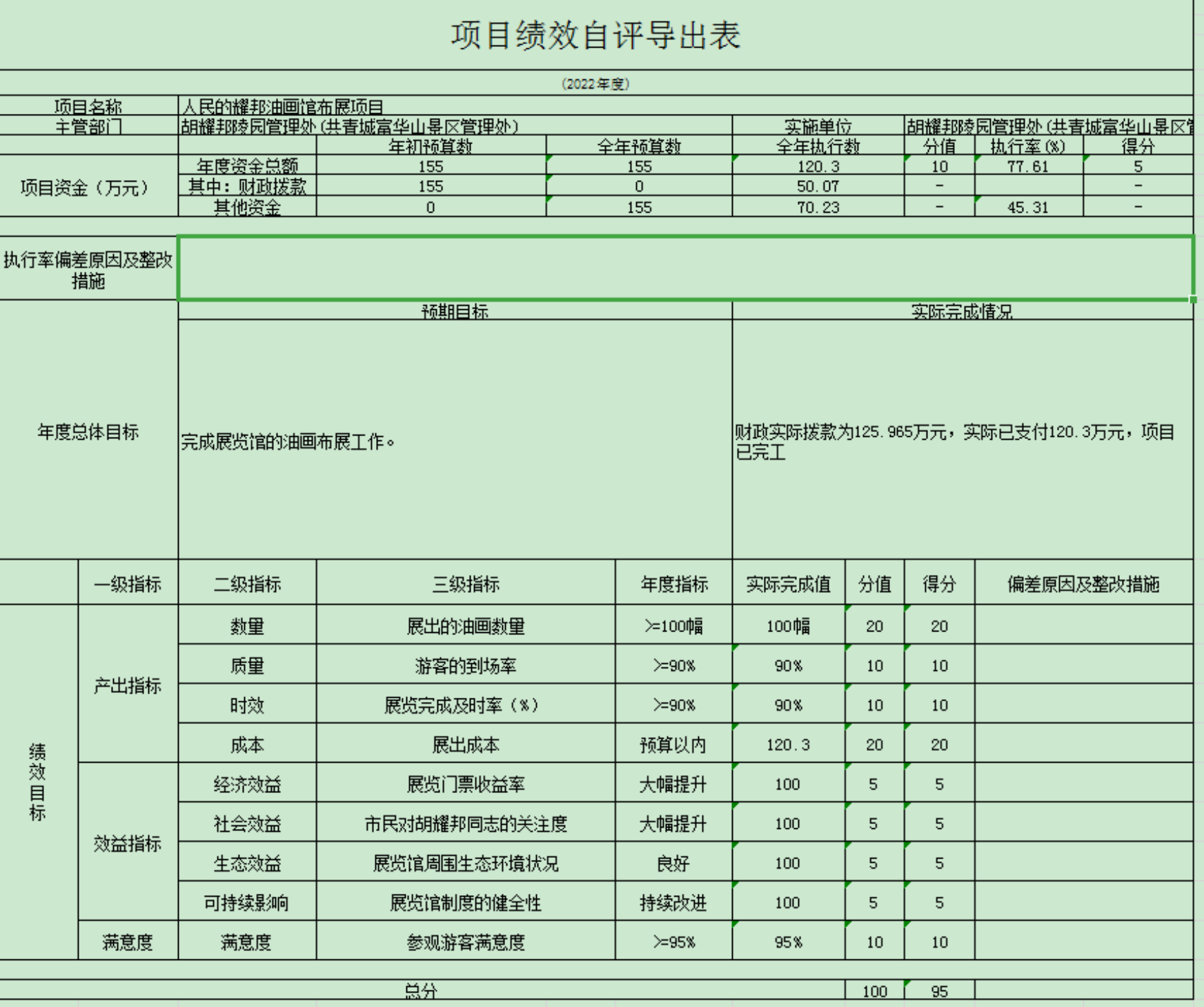 6.人民的耀邦油画馆布展项目年初预算资金155万元,财政安排资金125.965万元,实际支出120.3万元。