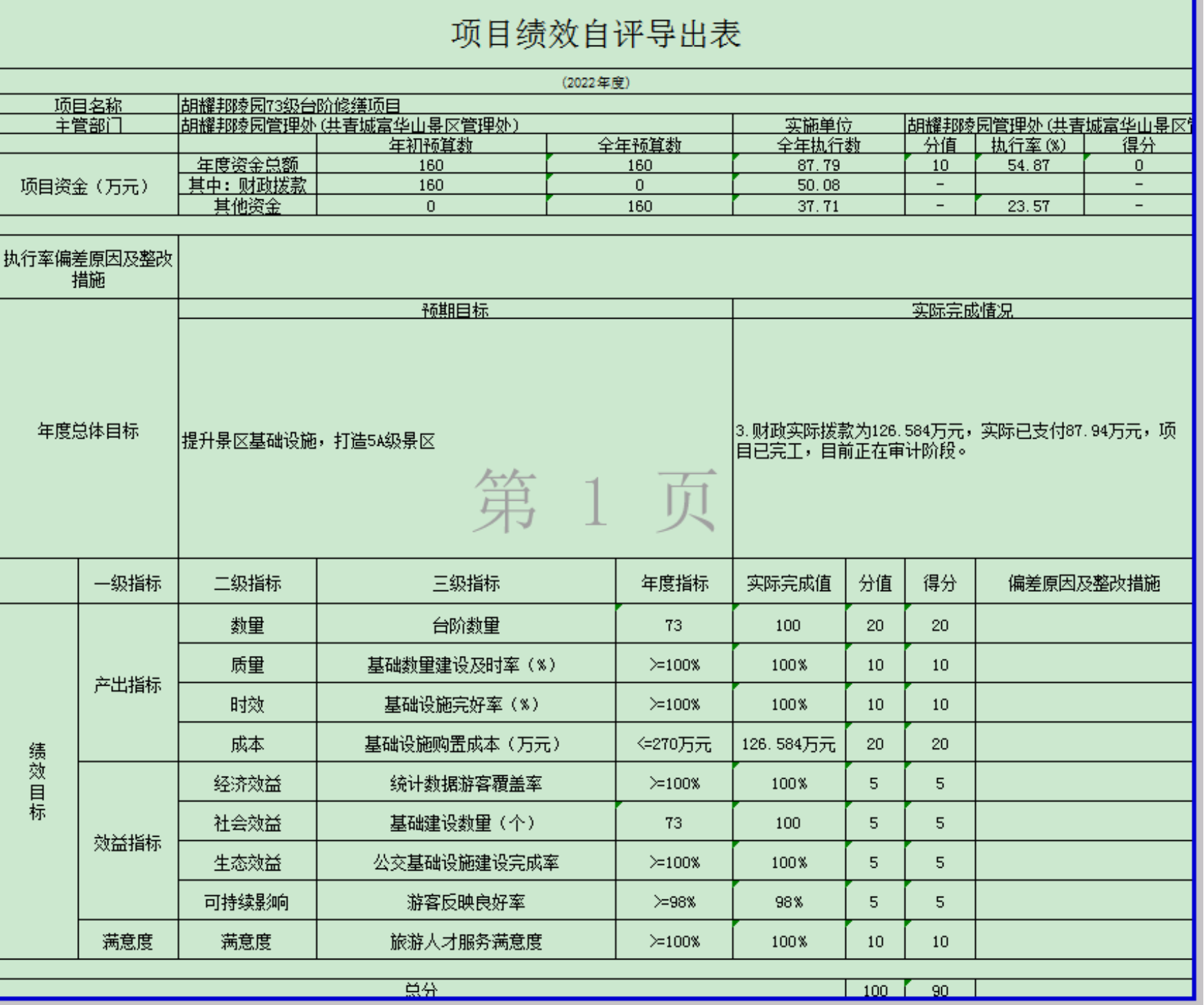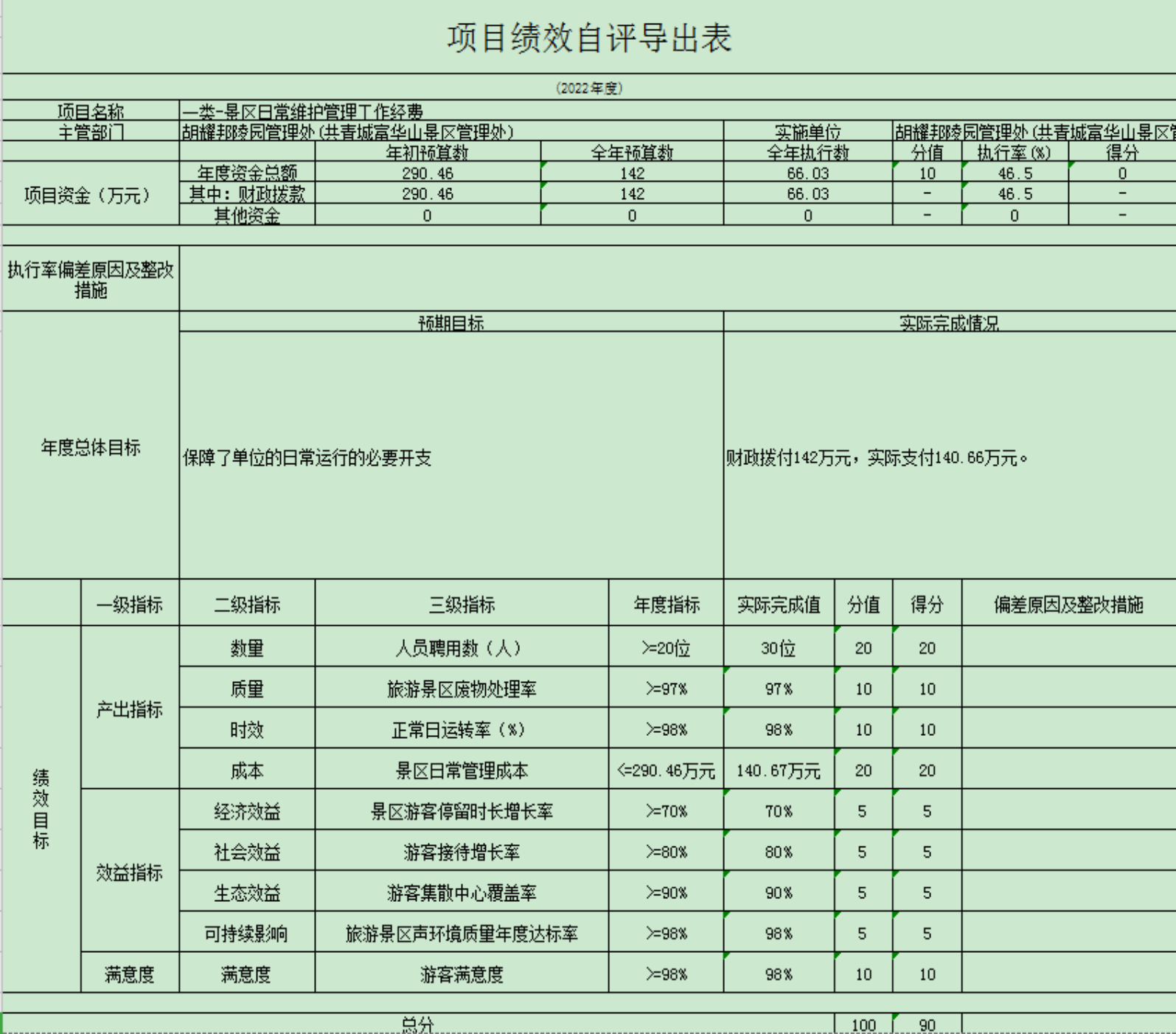 组织对“景区绿化”“景区旅游宣传”“景区日常管理维护工作”等8个项目开展了部门评价,涉及一般公共预算支出778.65万元,政府性基金预算支出 0 万元,国有资本预算支出 0 万元。从评价情况来看,各项工作顺利完成目标要求,保障了单位正常运转,为游客提供了安全舒适的游览环境。完成各项讲解共750次,其中游客讲解445次,政府接待305次,接待了原湖南省委书记许达哲、江西省委常委、宣传部长庄兆林两位部级领导,完成了全国“金牌导游”培养项目专题培训班现场教学工作。研发了2堂党课,支付了16名政府购岗人员工资及其他福利,成功采购2辆旅游观光电瓶车,尤其是在创建国家5A级旅游景区工作方面,通过高效联动创建合力、扎实推进项目建设、着力提高运营成效、擦亮生态旅游名片等举措,提升了富华山旅游区的知名度。