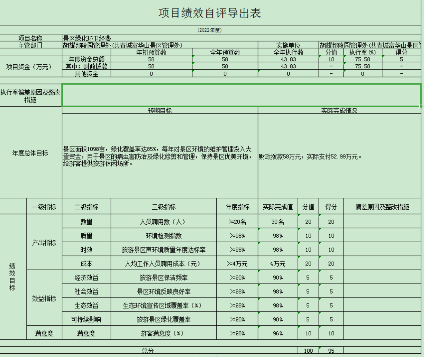 3.景区绿化环卫经费年初预算资金58万元,财政安排资金58万元,实际支出52.99万元。