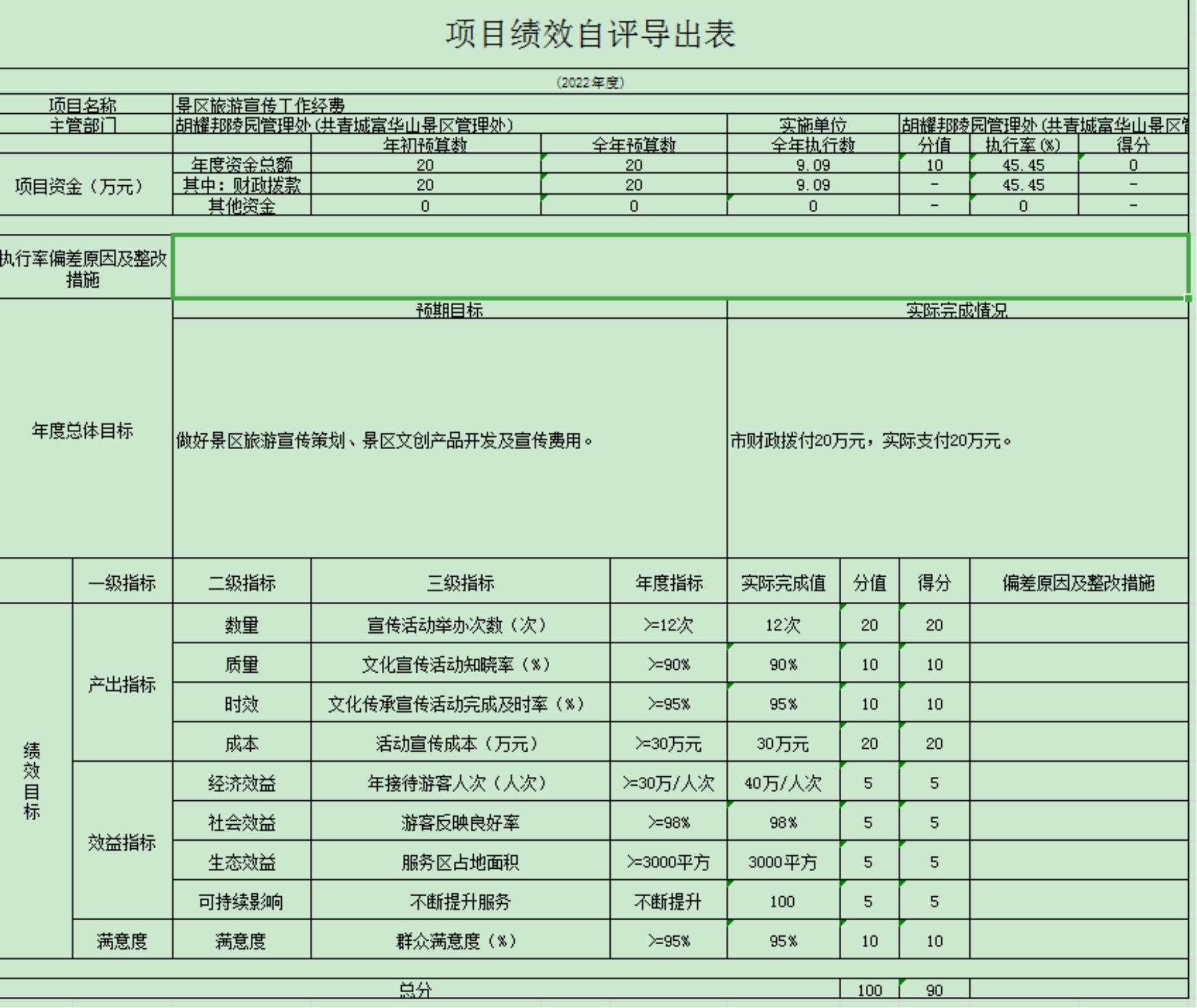 2.景区旅游宣传工作经费年初预算资金20万元,财政安排资金20万元,实际支出20万元。
