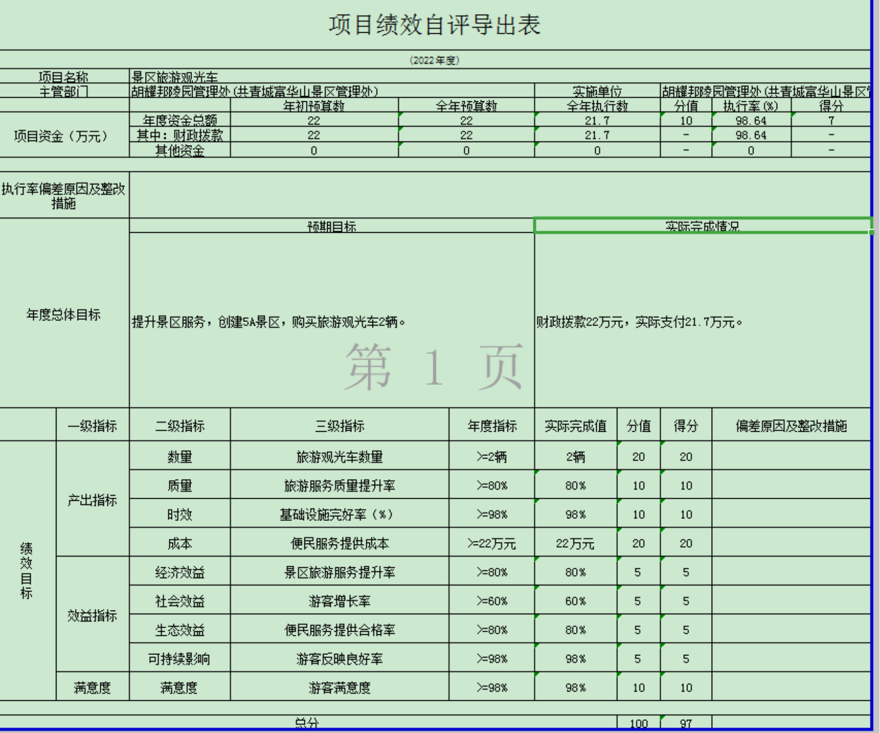 5.景区旅游观光车年初预算资金22万元,财政安排资金22万元,实际支出21.7万元。