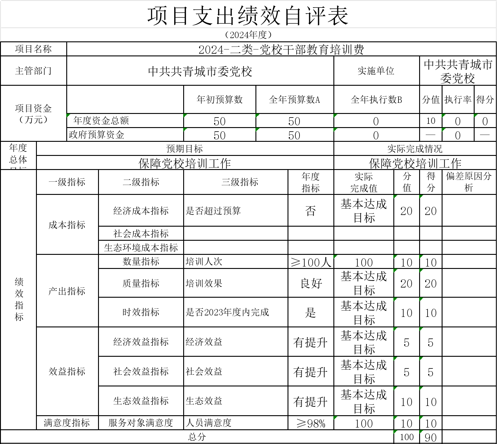 党校干部教育培训费项目绩效自评综述:根据年初设定的绩效目标,党校干部教育培训费项目自评分为90分,项目全年预算数为50万元,执行数为0万元,完成预算的0%。主要产出和效果,提高履职能力,提升能力水平。