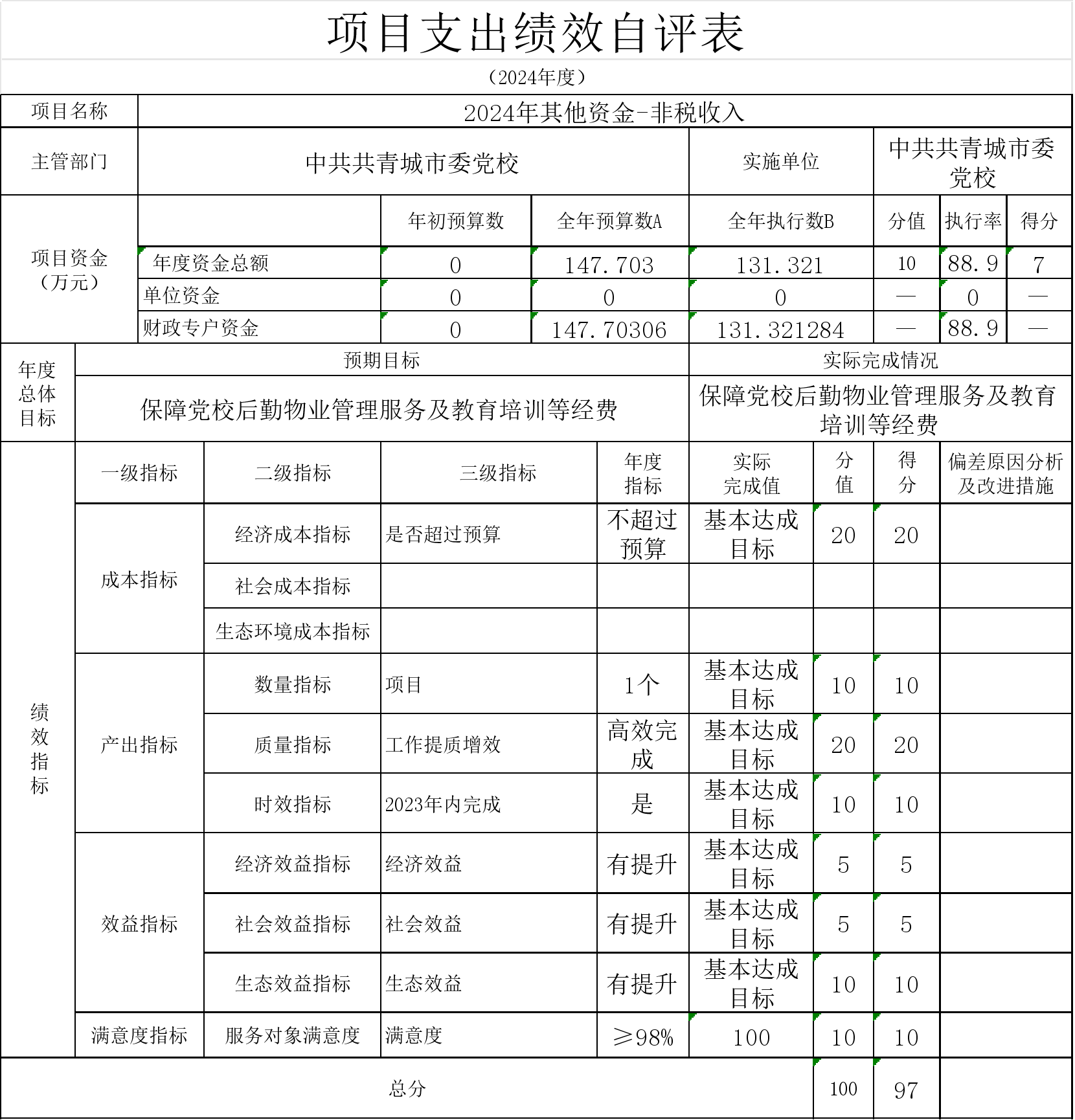 中共共青城市委党校(本级)“2024-一类-日常运行经费”“2024年其他资金-非税收入” 等项目支出绩效自评结果如下: