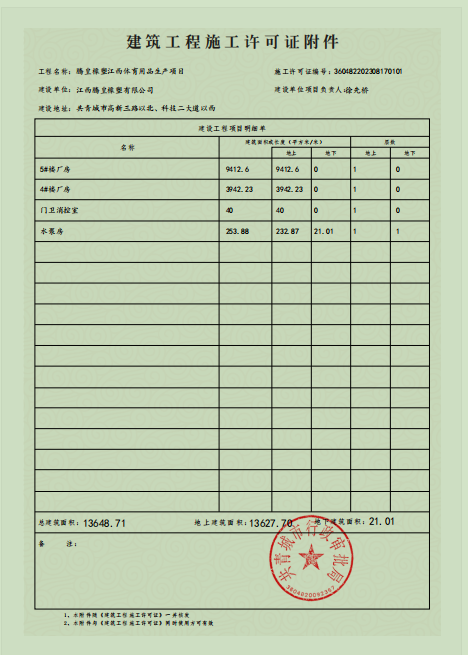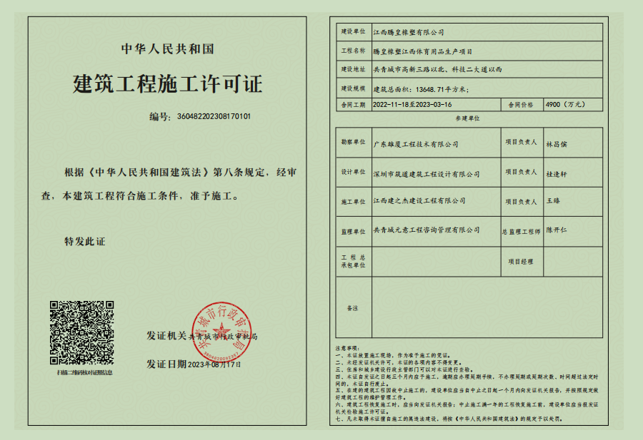 腾皇橡塑江西体育用品生产项目施工许可证