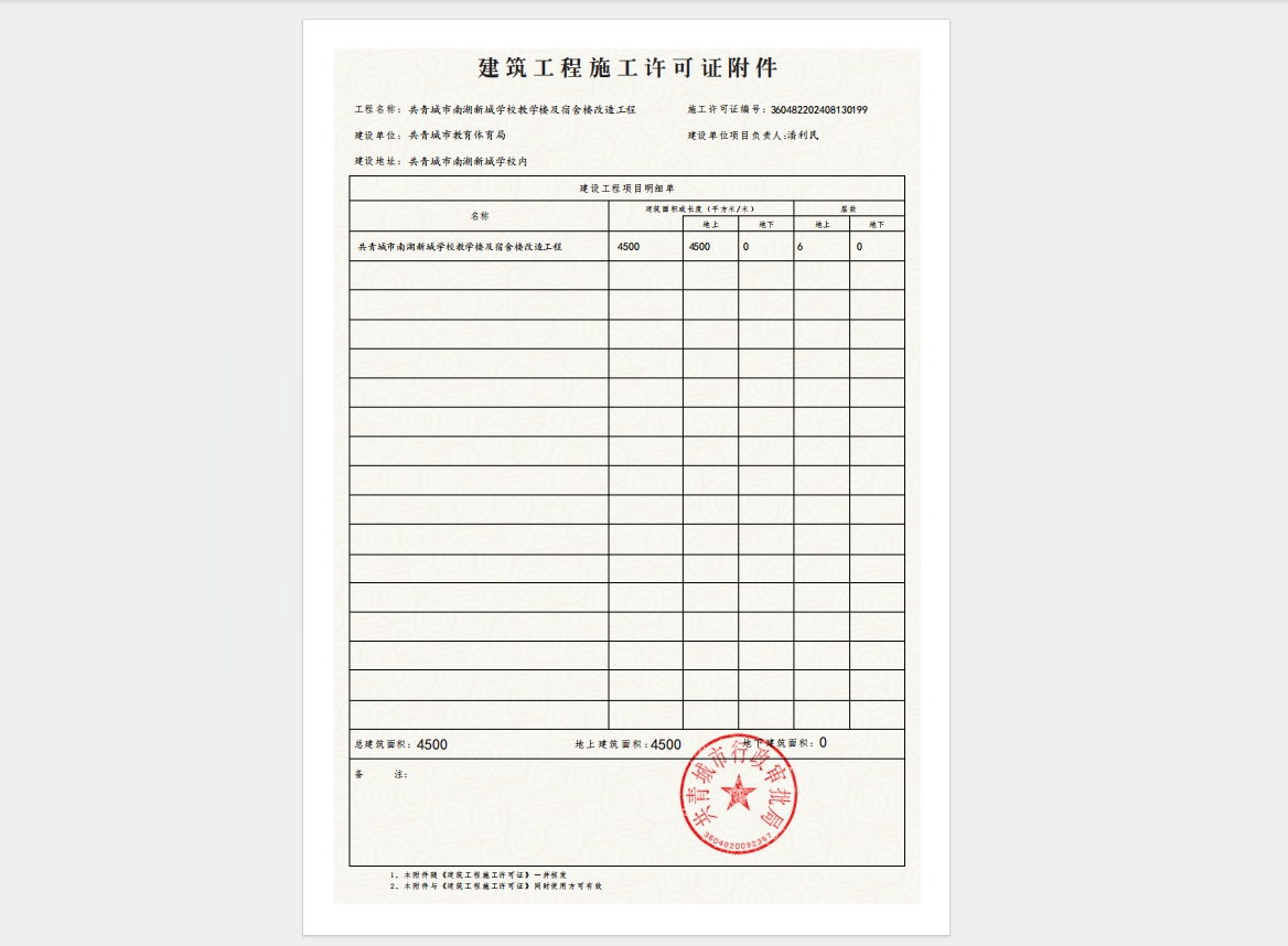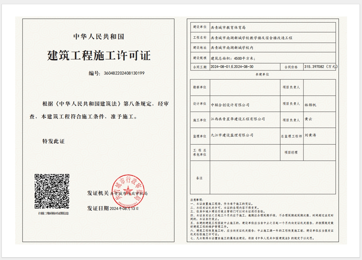 共青城市南湖新城学校教学楼及宿舍楼改造工程施工许可证