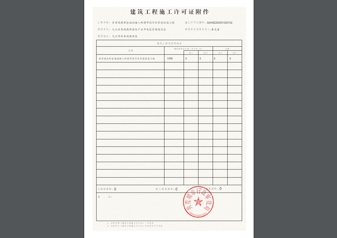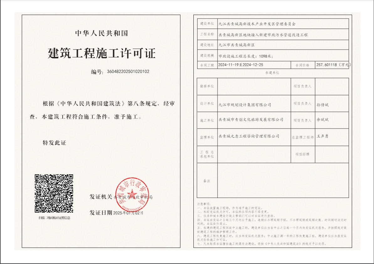共青城高新区地块接入新建市政污水管道改造工程施工许可证