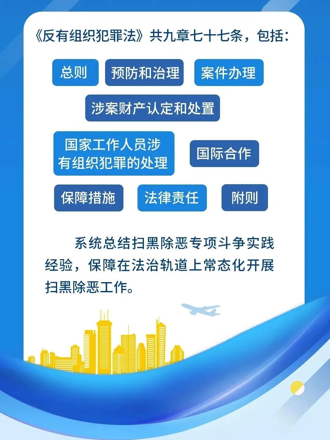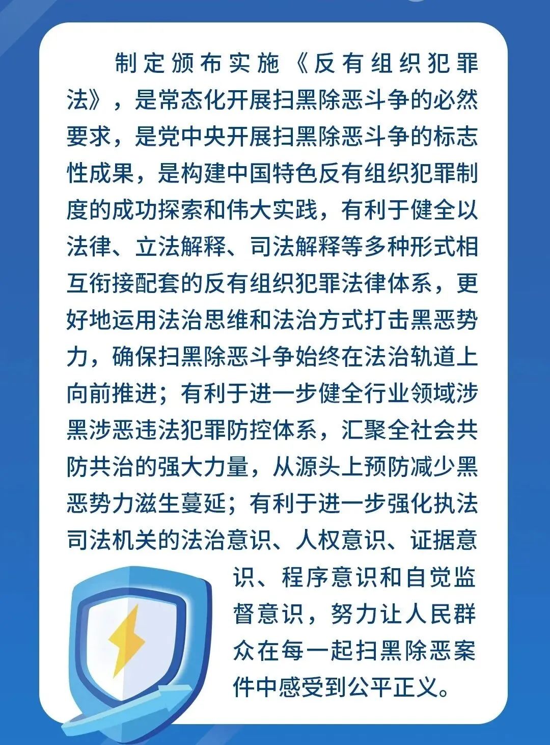 为了保证扫黑除恶斗争在法治轨道上常态化开展,2021年12月24日,第十三届全国人大常委会第三十二次会议表决通过了《中华人民共和国反有组织犯罪法》(以下简称《反有组织犯罪法》),自2022年5月1日起施行。这是我国第一部反有组织犯罪的专门法律。