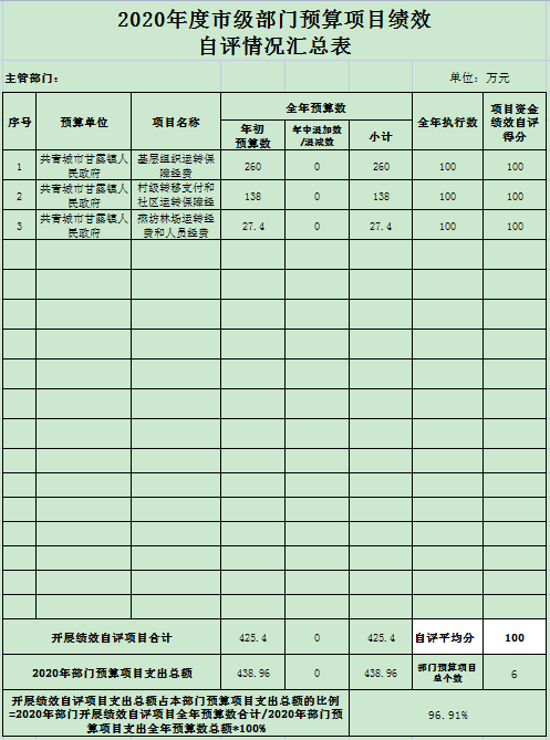 根据预算绩效管理要求,我部门组织对2020年度一般公共预算项目支出3个二级项目开展绩效自评,共涉及资金425.40万元,占一般公共预算项目支出总额的96.91%。
