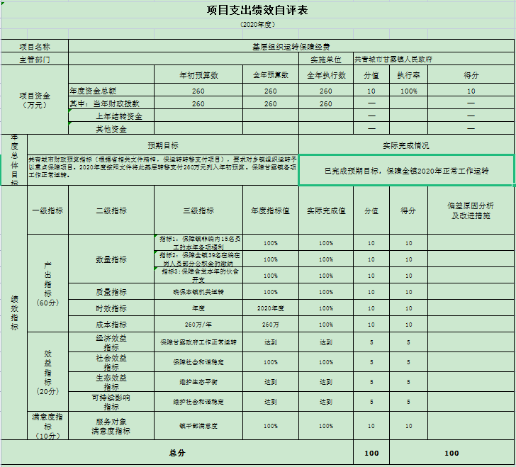 基层组织运转保障经费项目绩效自评得分为100分。项目全年预算数为260万元,执行数为260万元,完成预算的100%。项目绩效目标完成情况:已完成预期目标,保障全镇2020年正常工作运转。